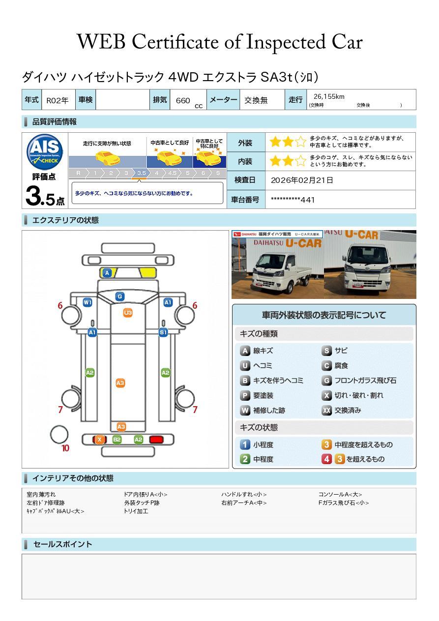 現状の車両の状態に関しましては必ず販売店に確認をお願いします。(2008年10月からの評価基準改定により、一部の車両につき店頭の評価表記と違う場合がございます。詳しくは販売店にお問い合わせください。