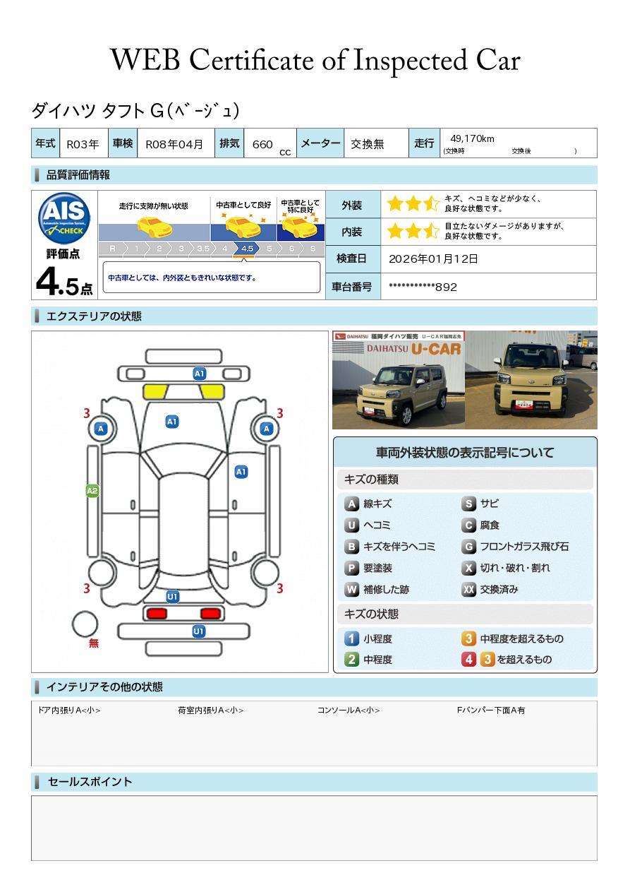 ダイハツ認定中古車なら展示車両の状態を開示しております。展示車両に自信があるからこそ出来るサービスです。
