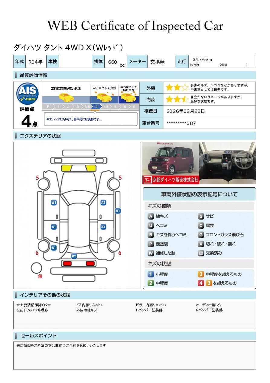 new タントX ワンオーナー 4WD ロングスライドシート 電動スライド(京都府)の中古車情報