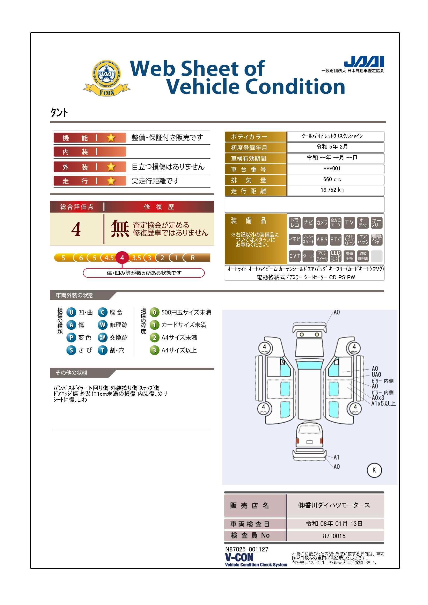 車両状態証明書の見方となります。検査団体によって、表記方法が異なりますので該当車両の車両状態証明書を御確認の上、ご覧ください。
