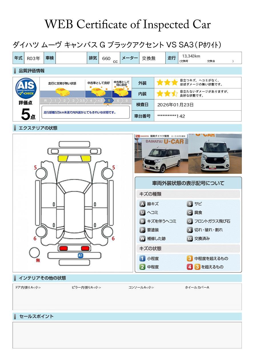 ダイハツ認定中古車なら展示車両の状態を開示しております。展示車両に自信があるからこそ出来るサービスです。