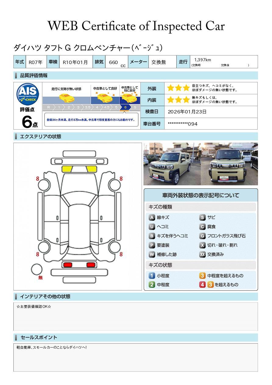 車両状態証明書が付いておりますので、安心してお選び出来ます。詳しくは、スタッフまでお気軽にお問合せください。