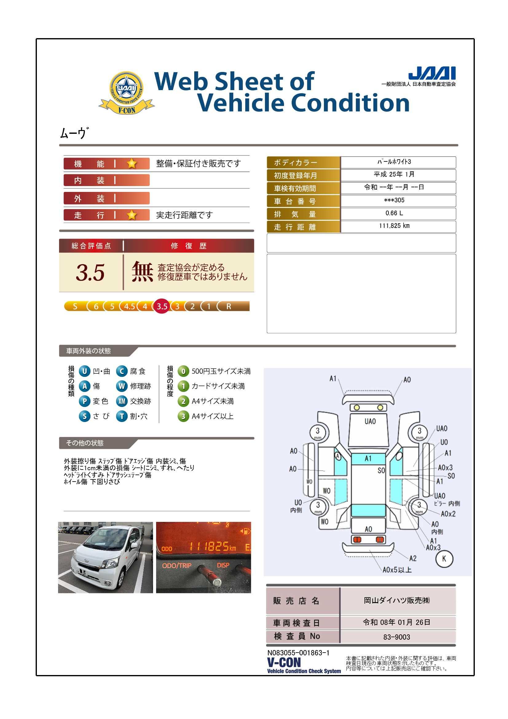現状の車両の状態に関しましては必ず販売店に確認をお願いします。(2008年10月からの評価基準改定により、一部の車両につき店頭の評価表記と違う場合がございます。詳しくは販売店にお問い合わせください。