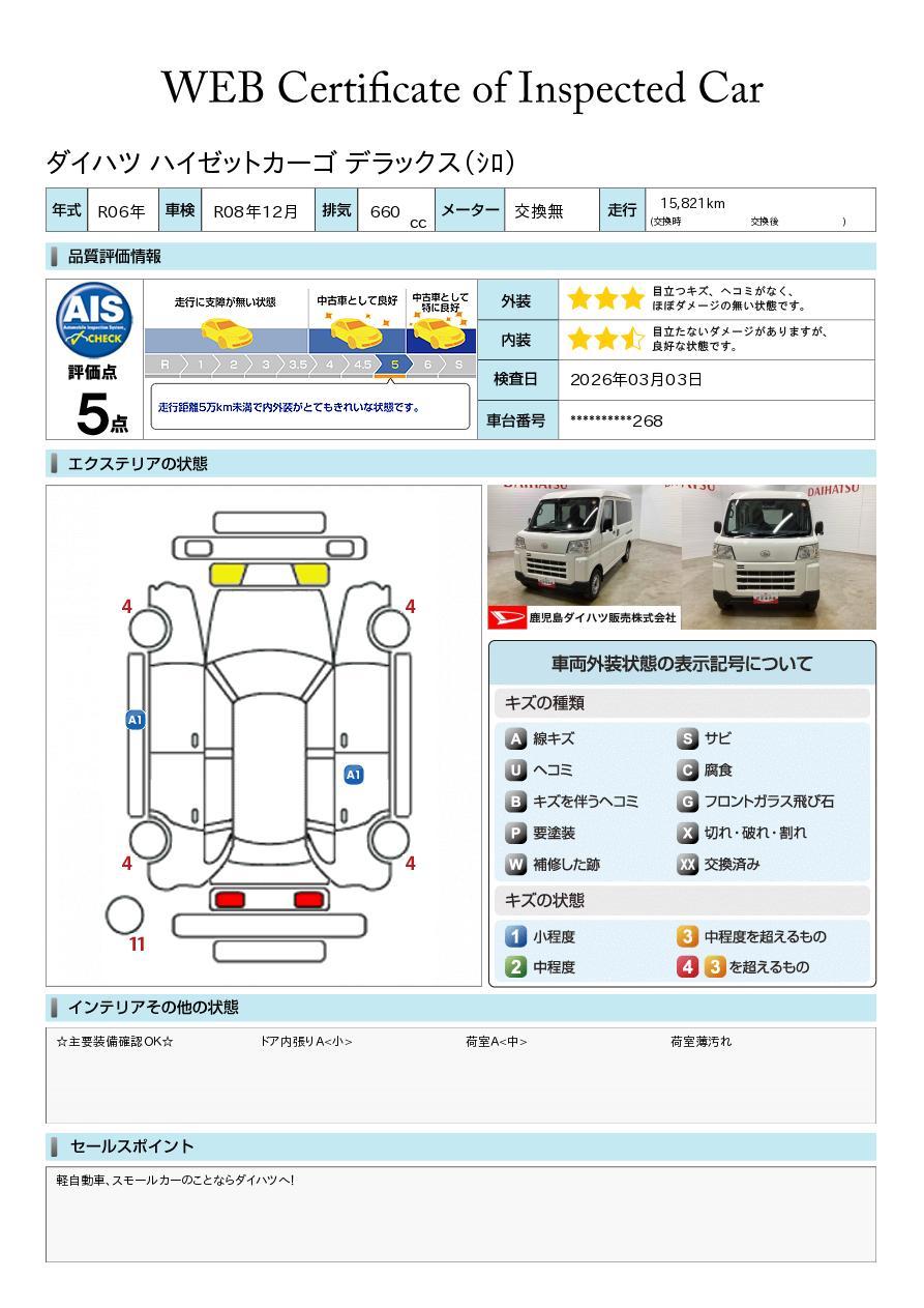 車両状態証明書が付いておりますので、安心してお選び出来ます。詳しくは、スタッフまでお気軽にお問合せください。
