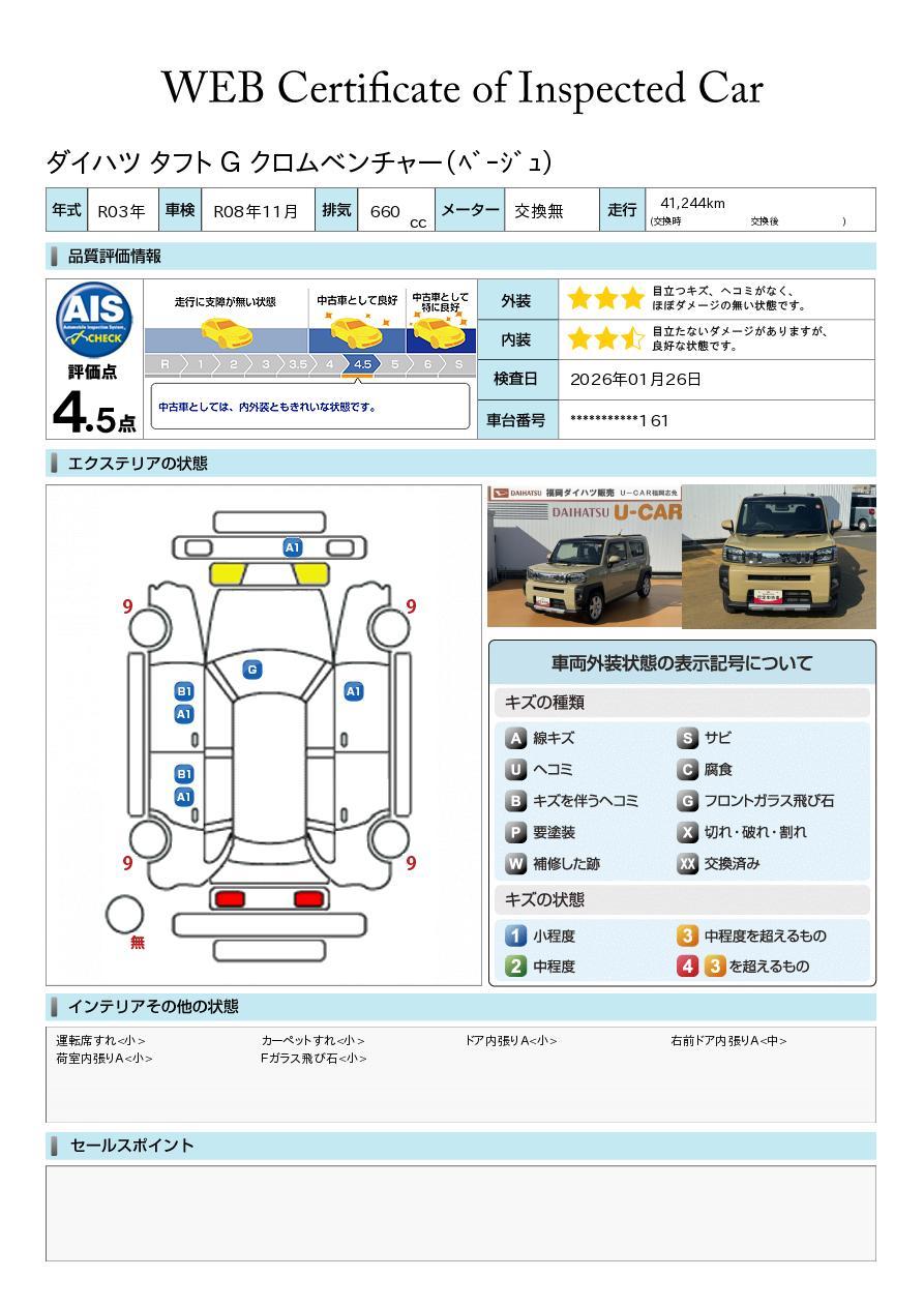 車両状態証明書が付いておりますので、安心してお選び出来ます。詳しくは、スタッフまでお気軽にお問合せください。
