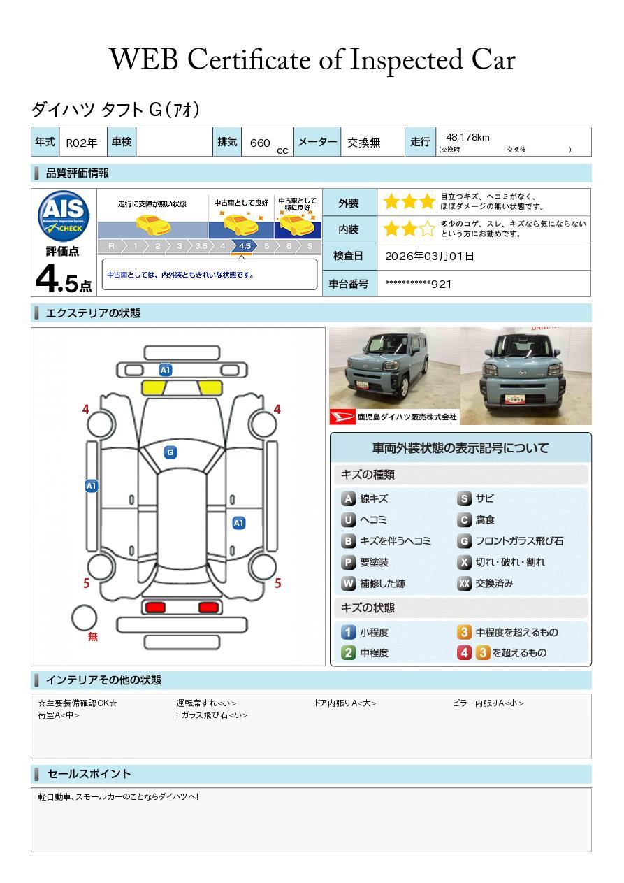 車両状態証明書が付いておりますので、安心してお選び出来ます。詳しくは、スタッフまでお気軽にお問合せください。