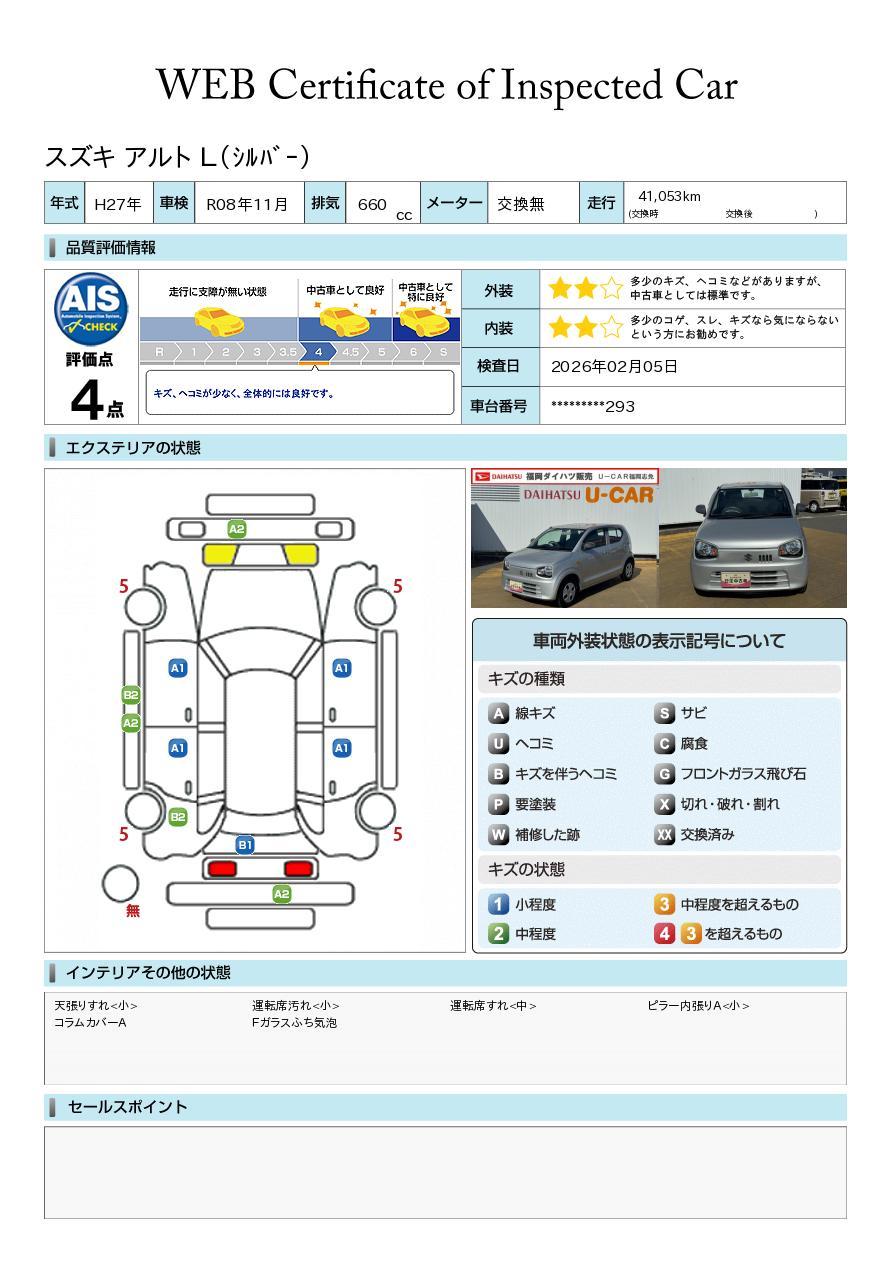 現状の車両の状態に関しましては必ず販売店に確認をお願いします。(2008年10月からの評価基準改定により、一部の車両につき店頭の評価表記と違う場合がございます。詳しくは販売店にお問い合わせください。