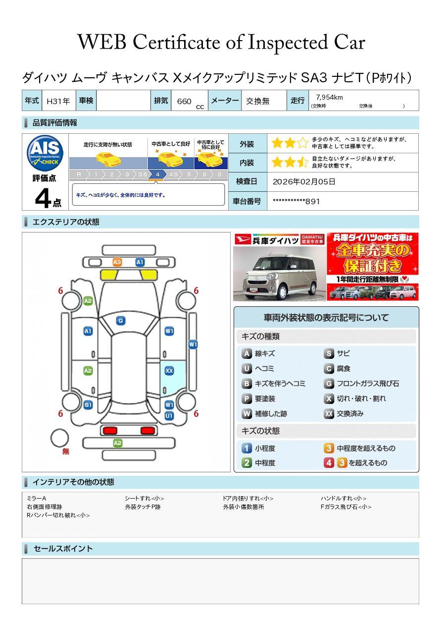 車両状態証明書が付いておりますので、安心してお選び出来ます。詳しくは、スタッフまでお気軽にお問合せください。