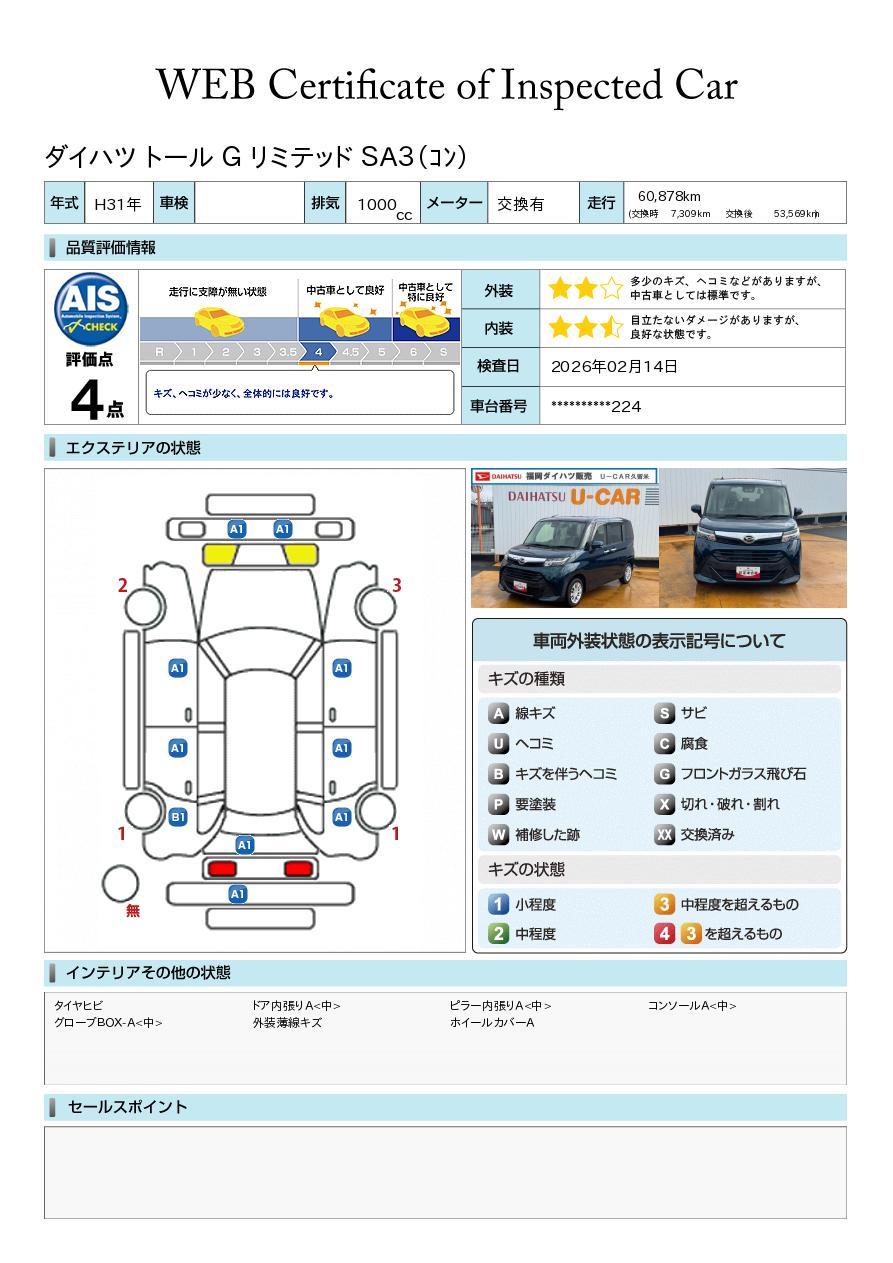 車両状態証明書が付いておりますので、安心してお選び出来ます。詳しくは、スタッフまでお気軽にお問合せください。