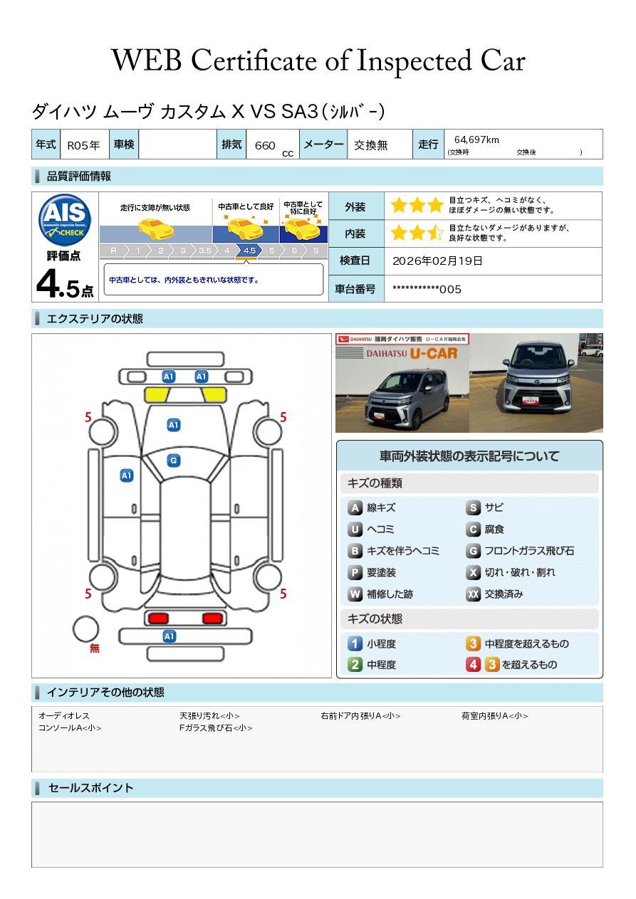 車両状態証明書が付いておりますので、安心してお選び出来ます。詳しくは、スタッフまでお気軽にお問合せください。