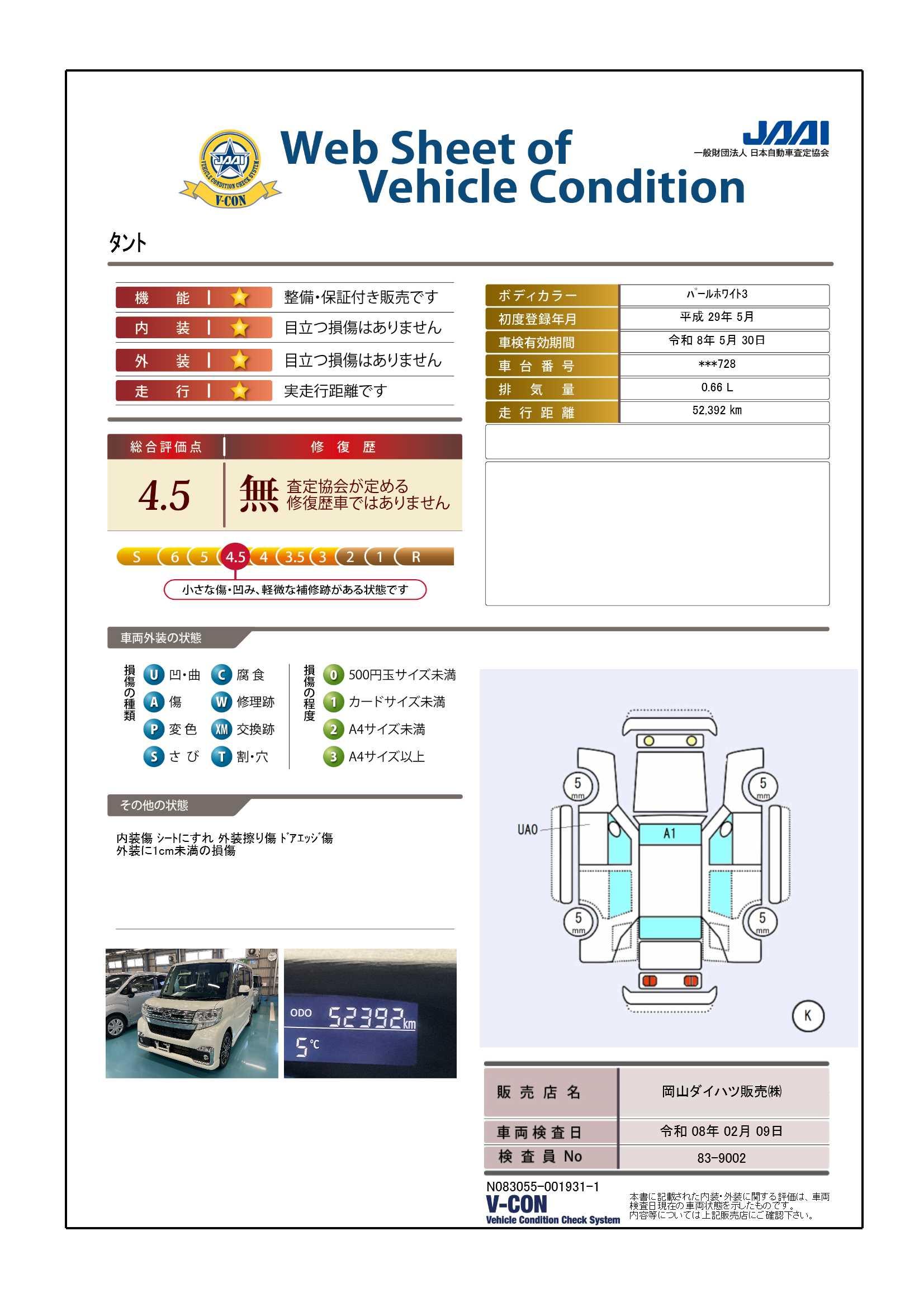 現状の車両の状態に関しましては必ず販売店に確認をお願いします。(2008年10月からの評価基準改定により、一部の車両につき店頭の評価表記と違う場合がございます。詳しくは販売店にお問い合わせください。