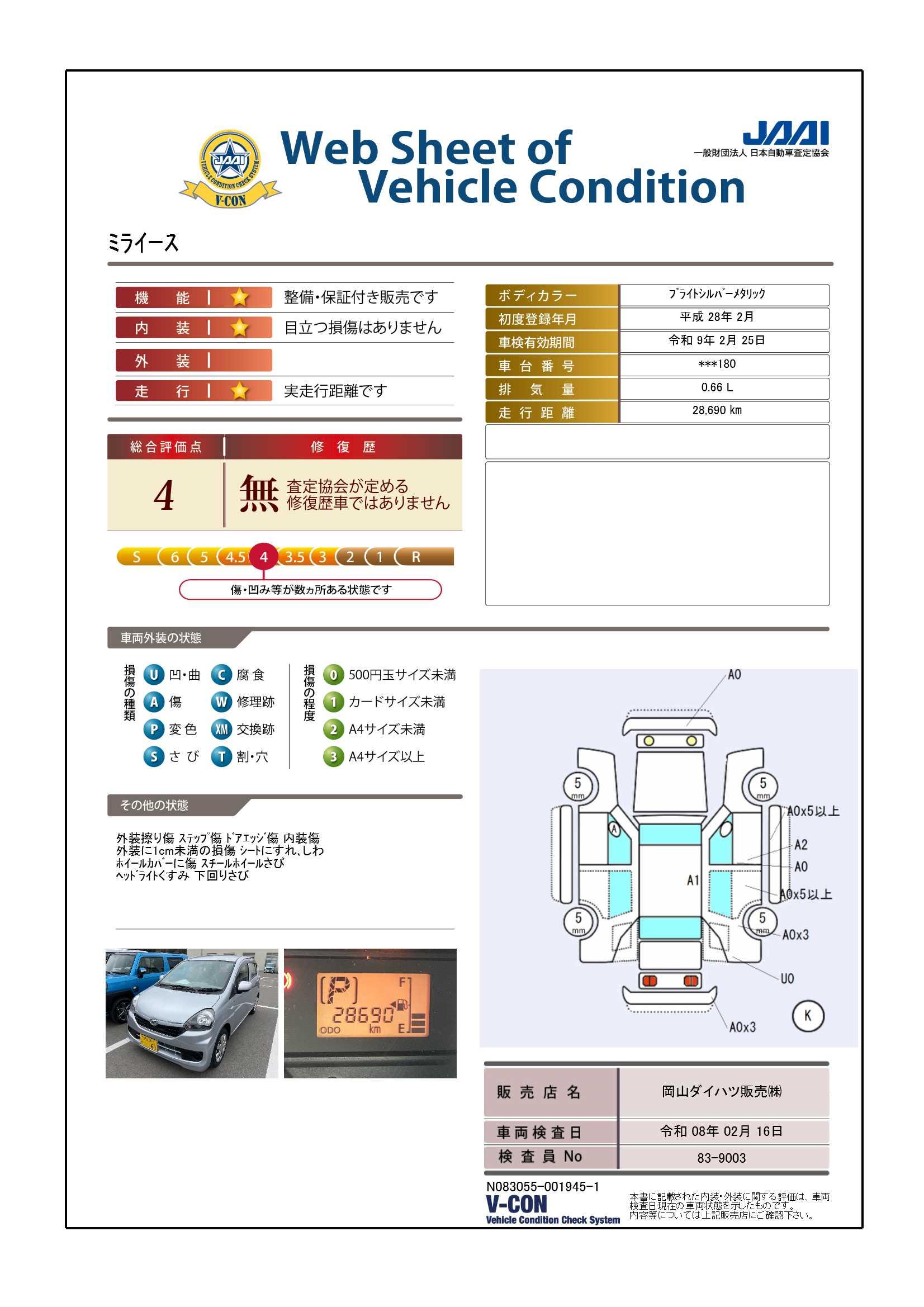 現状の車両の状態に関しましては必ず販売店に確認をお願いします。(2008年10月からの評価基準改定により、一部の車両につき店頭の評価表記と違う場合がございます。詳しくは販売店にお問い合わせください。