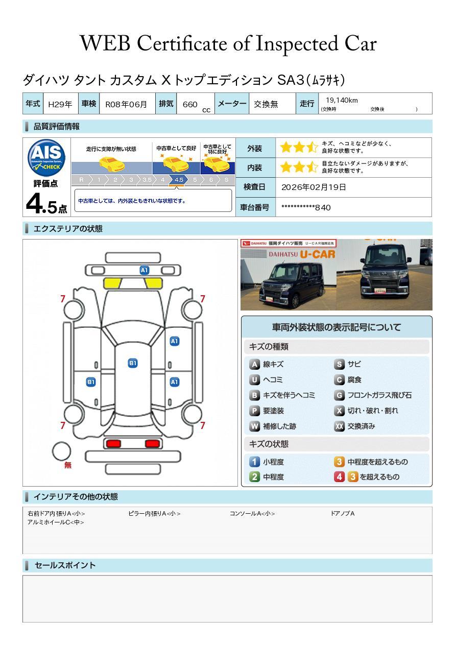 車両状態証明書が付いておりますので、安心してお選び出来ます。詳しくは、スタッフまでお気軽にお問合せください。