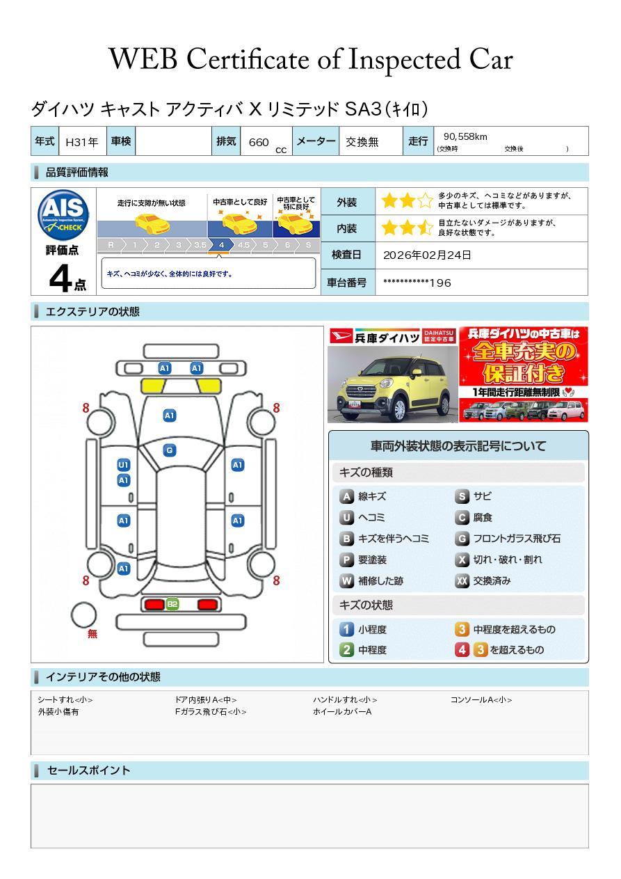 車両状態証明書が付いておりますので、安心してお選び出来ます。詳しくは、スタッフまでお気軽にお問合せください。