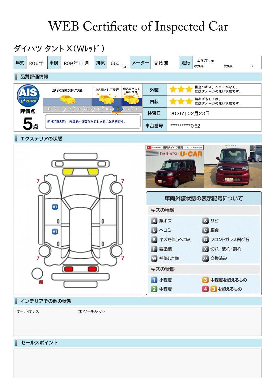 現状の車両の状態に関しましては必ず販売店に確認をお願いします。(2008年10月からの評価基準改定により、一部の車両につき店頭の評価表記と違う場合がございます。詳しくは販売店にお問い合わせください。