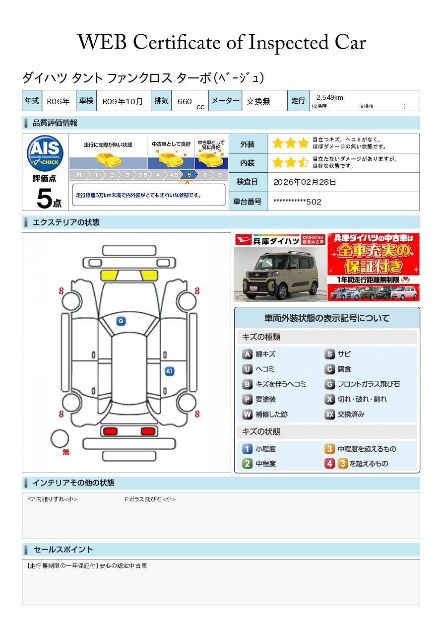 現状の車両の状態に関しましては必ず販売店に確認をお願いします。(2008年10月からの評価基準改定により、一部の車両につき店頭の評価表記と違う場合がございます。詳しくは販売店にお問い合わせください。