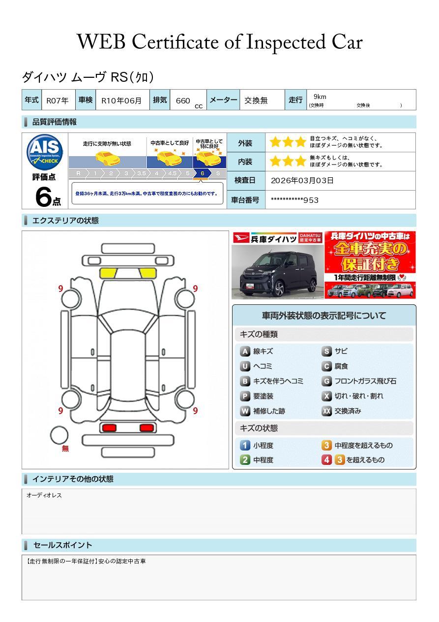 車両状態証明書が付いておりますので、安心してお選び出来ます。詳しくは、スタッフまでお気軽にお問合せください。