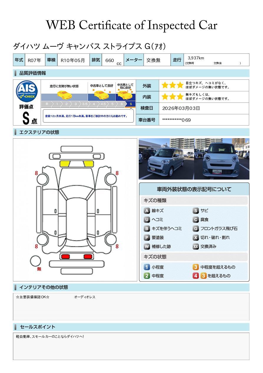 車両状態証明書が付いておりますので、安心してお選び出来ます。詳しくは、スタッフまでお気軽にお問合せください。