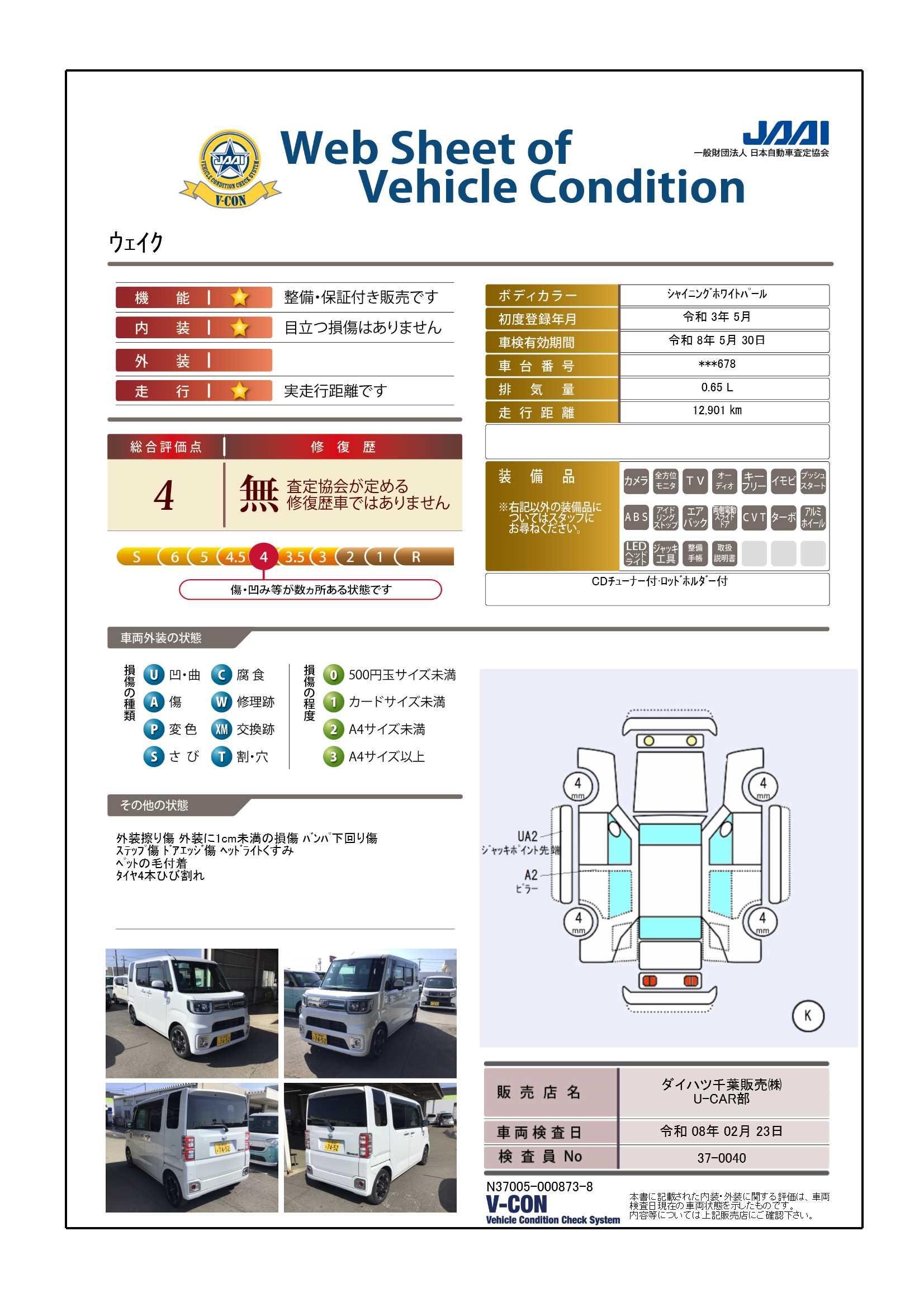 外装のキズや凹み、室内の匂いなどをご来店にて車両状態の確認をお願いします♪ お引渡しの前に車検整備を実施してお引渡しを致します。 ダイハツ中古車保証12か月・走行距離無制限付きです。