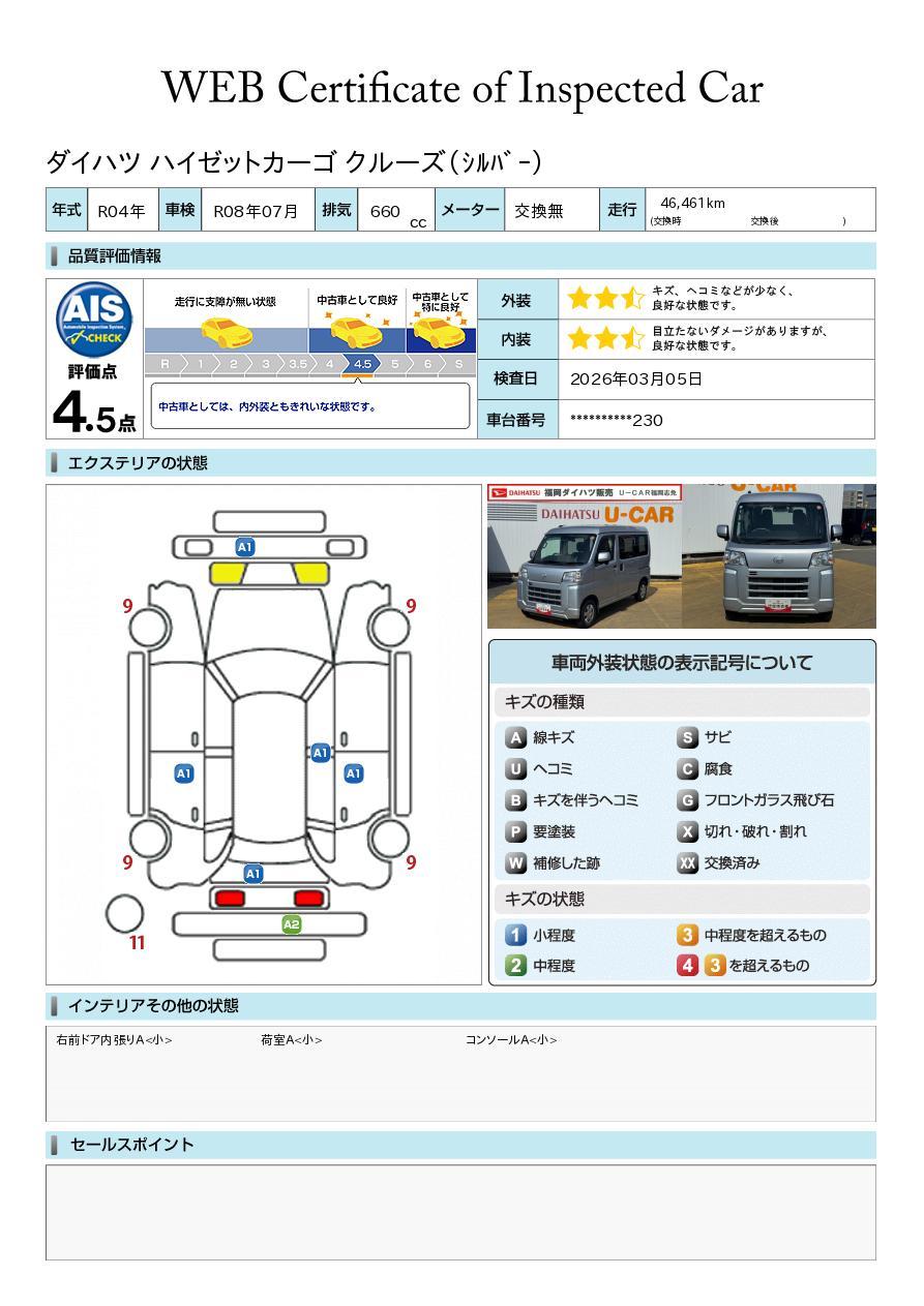株式会社AISの車両状態証明書となります。
