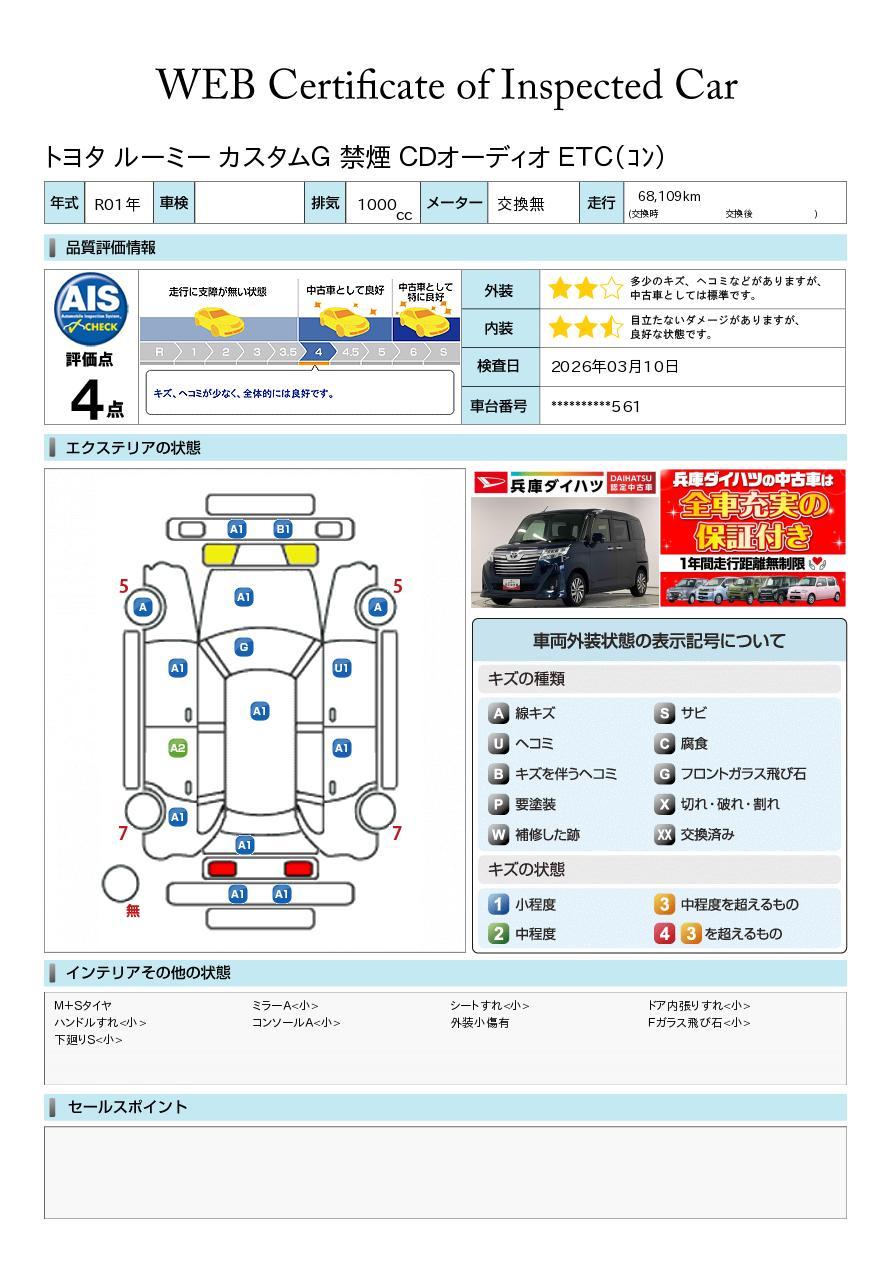 車両状態証明書が付いておりますので、安心してお選び出来ます。詳しくは、スタッフまでお気軽にお問合せください。