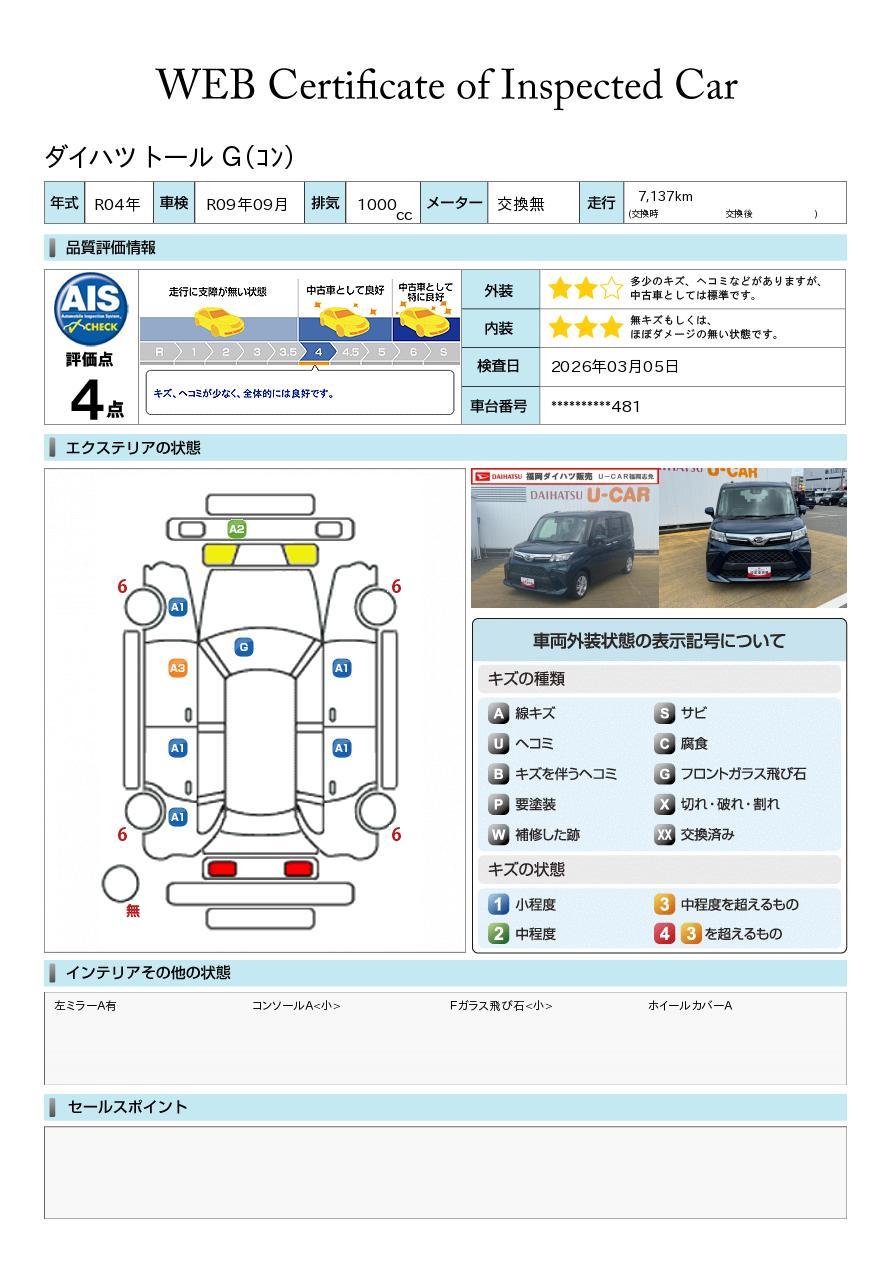 車両状態証明書が付いておりますので、安心してお選び出来ます。詳しくは、スタッフまでお気軽にお問合せください。