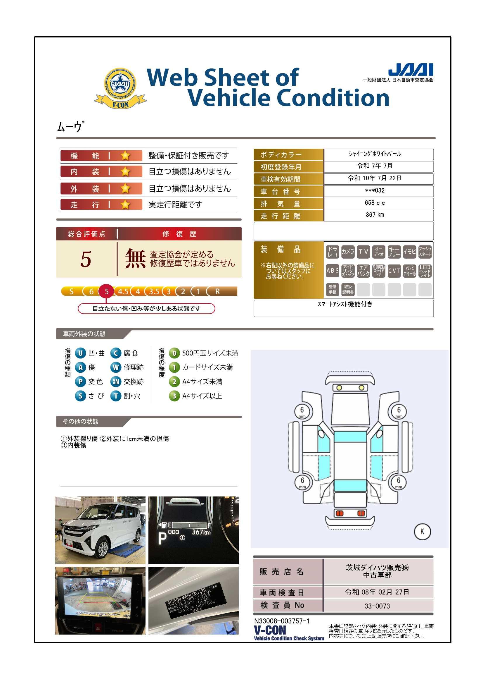 安心3【状態】車両状態証明書でキズや修復歴の有無を確認できます!気になる点は事前にご説明いたします♪