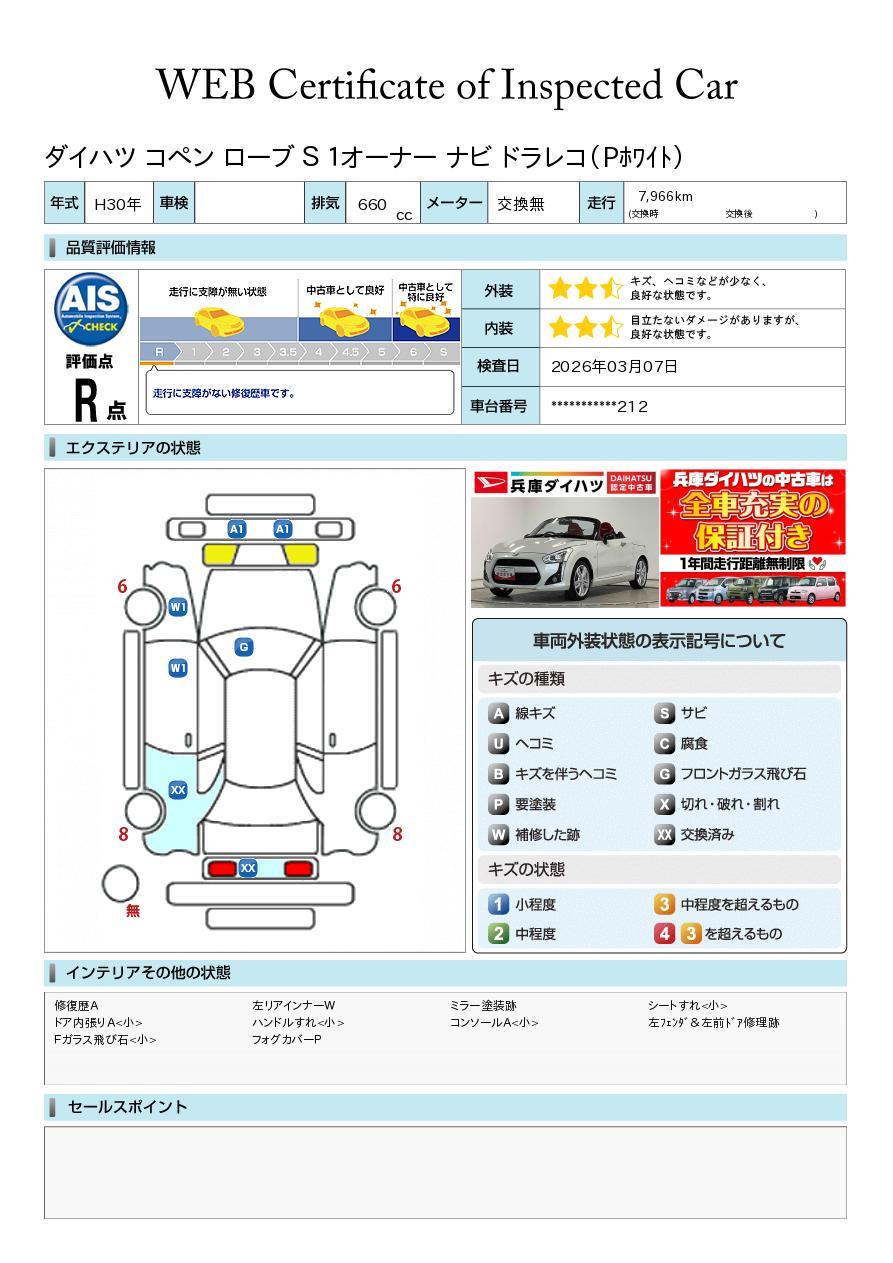 車両状態証明書が付いておりますので、安心してお選び出来ます。詳しくは、スタッフまでお気軽にお問合せください。