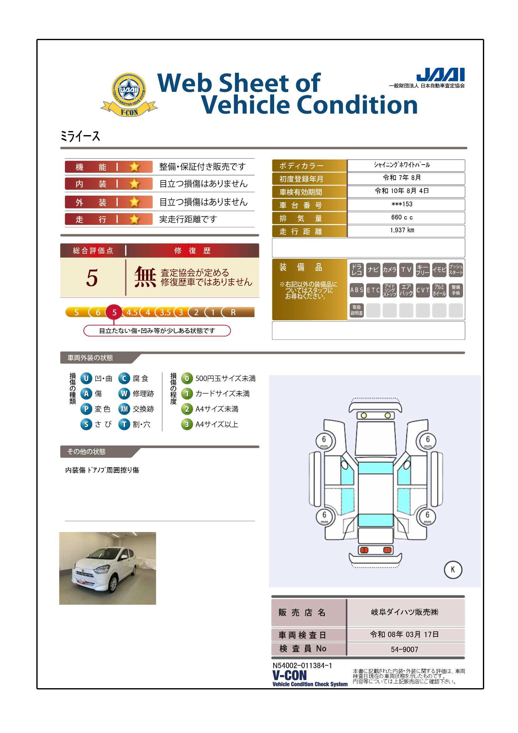 現状の車両の状態に関しましては必ず販売店に確認をお願いします。(2008年10月からの評価基準改定により、一部の車両につき店頭の評価表記と違う場合がございます。詳しくは販売店にお問い合わせください。
