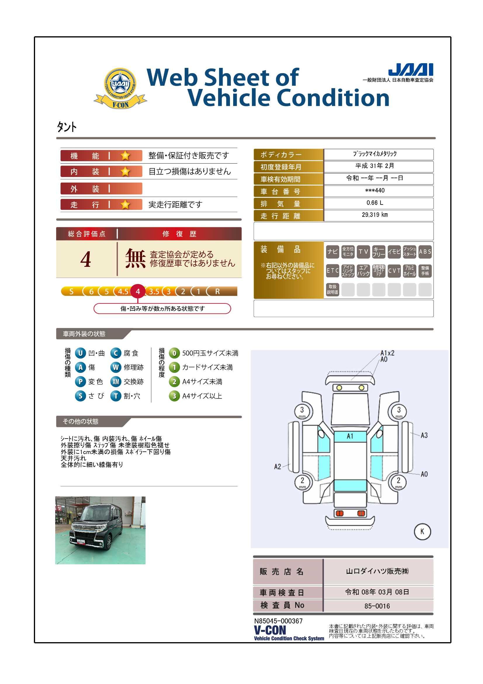 現状の車両の状態に関しましては必ず販売店に確認をお願いします。(2008年10月からの評価基準改定により、一部の車両につき店頭の評価表記と違う場合がございます。詳しくは販売店にお問い合わせください。