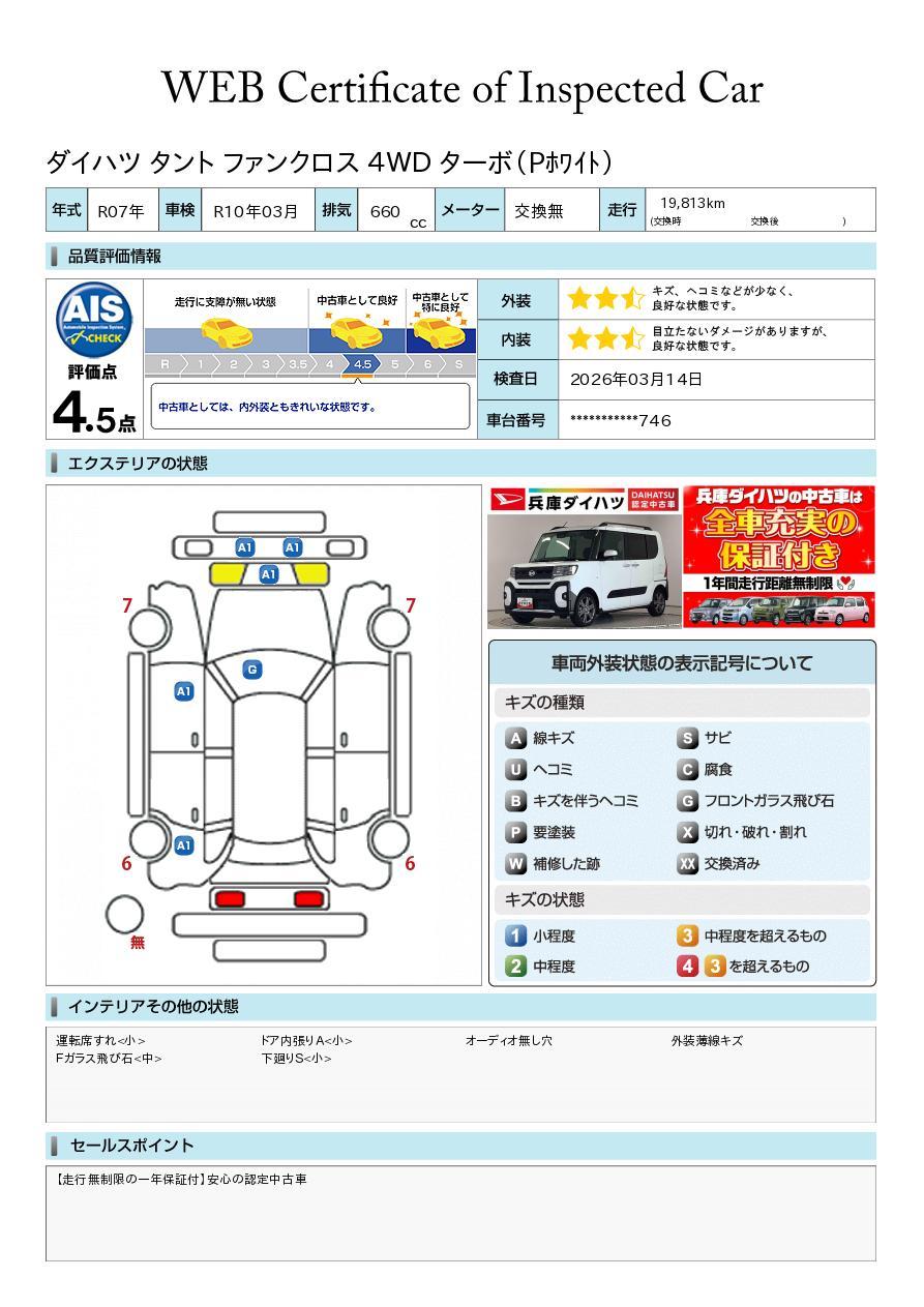 車両状態証明書が付いておりますので、安心してお選び出来ます。詳しくは、スタッフまでお気軽にお問合せください。