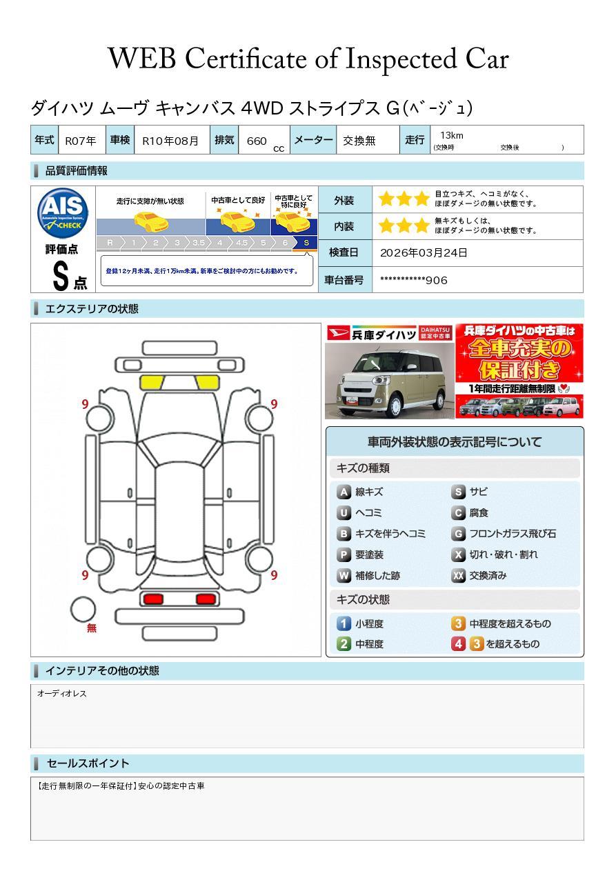 車両状態証明書が付いておりますので、安心してお選び出来ます。詳しくは、スタッフまでお気軽にお問合せください。