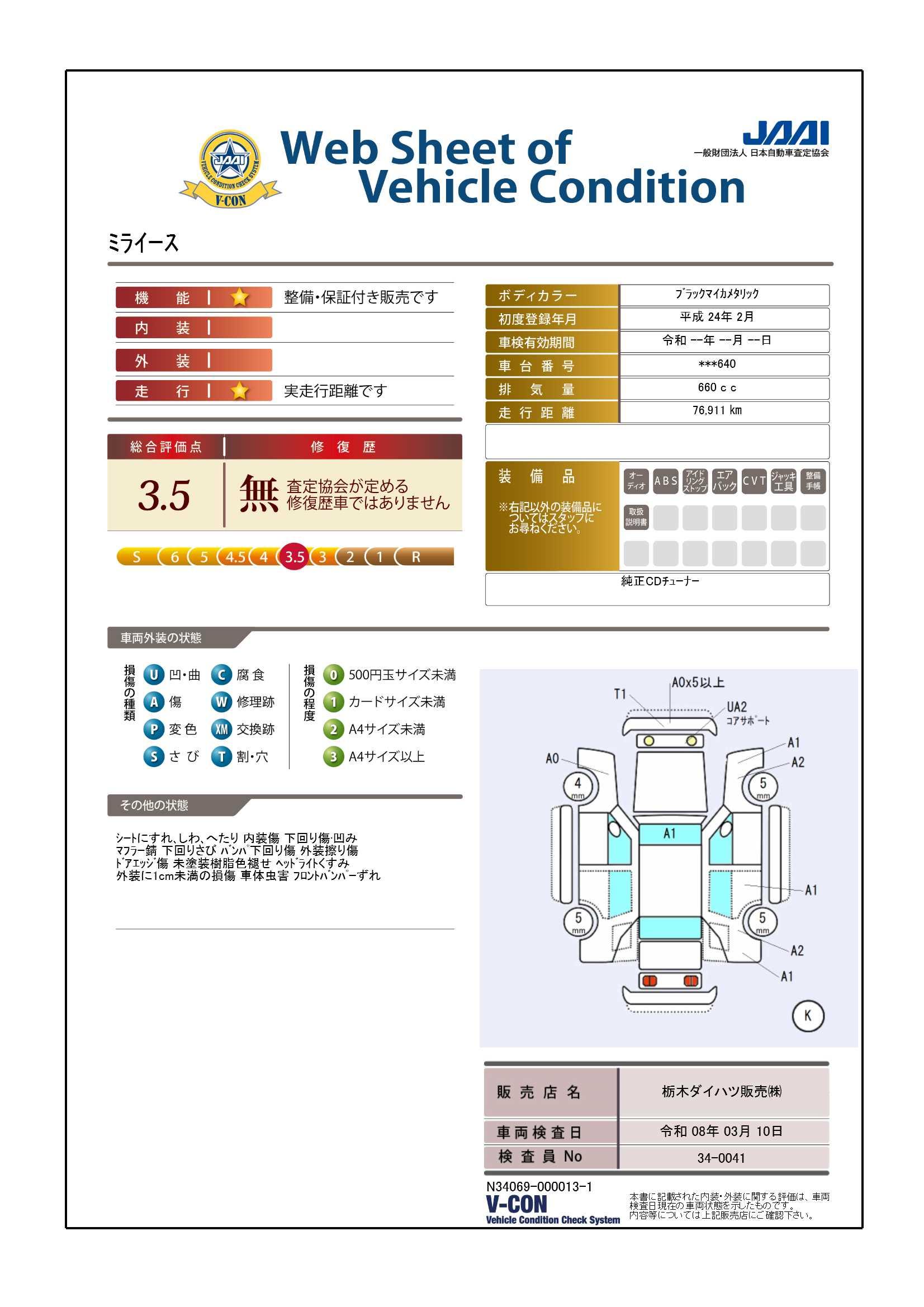 一般財団法人 日本自動車査定協会の車両状態証明書となります。