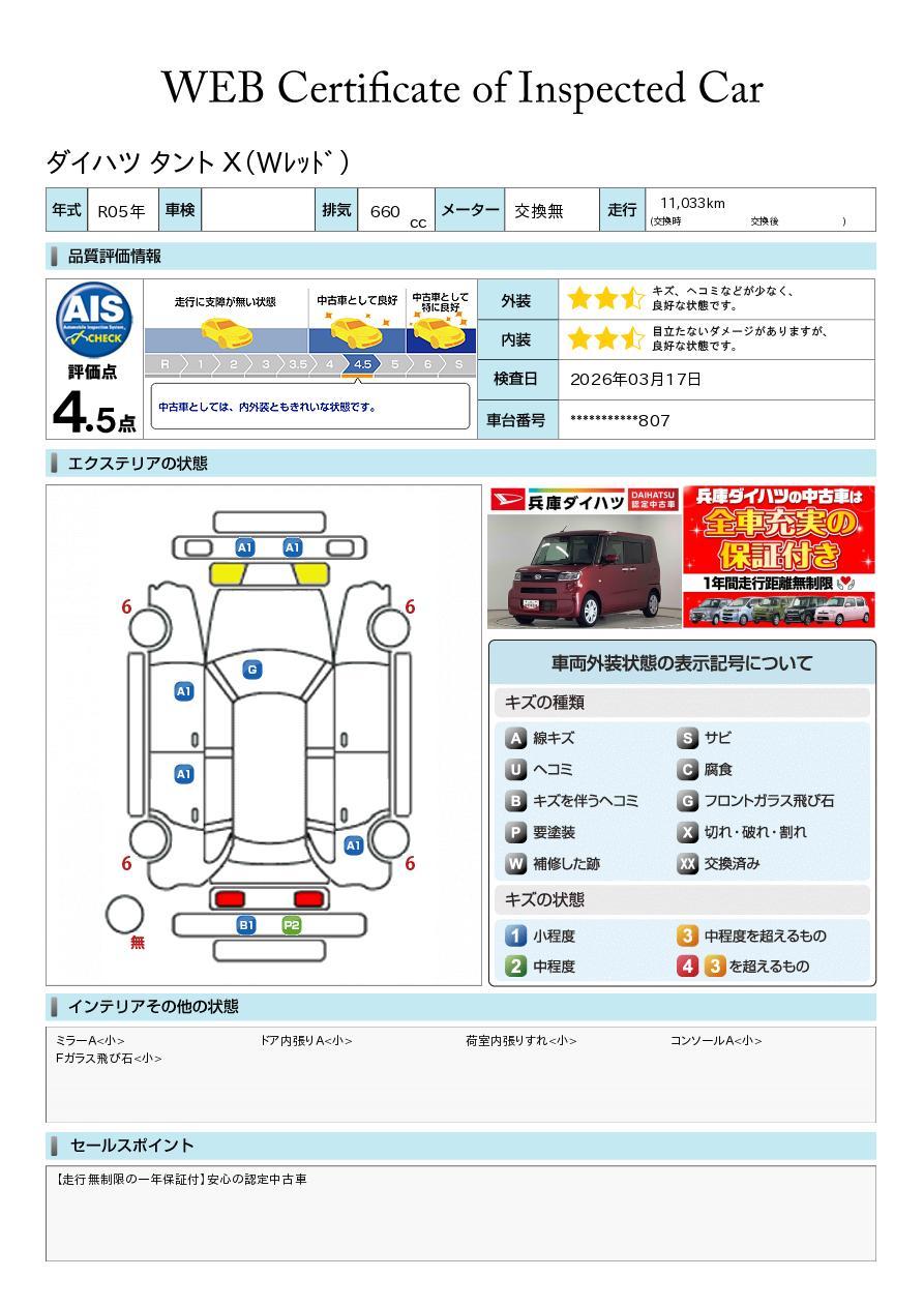 株式会社AISの車両状態証明書となります。