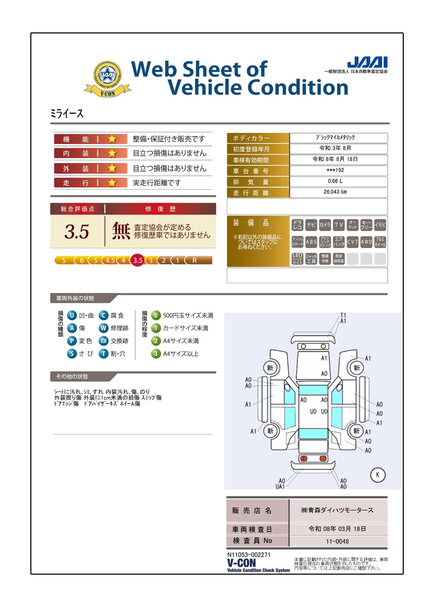 一般財団法人 日本自動車査定協会の車両状態証明書となります。