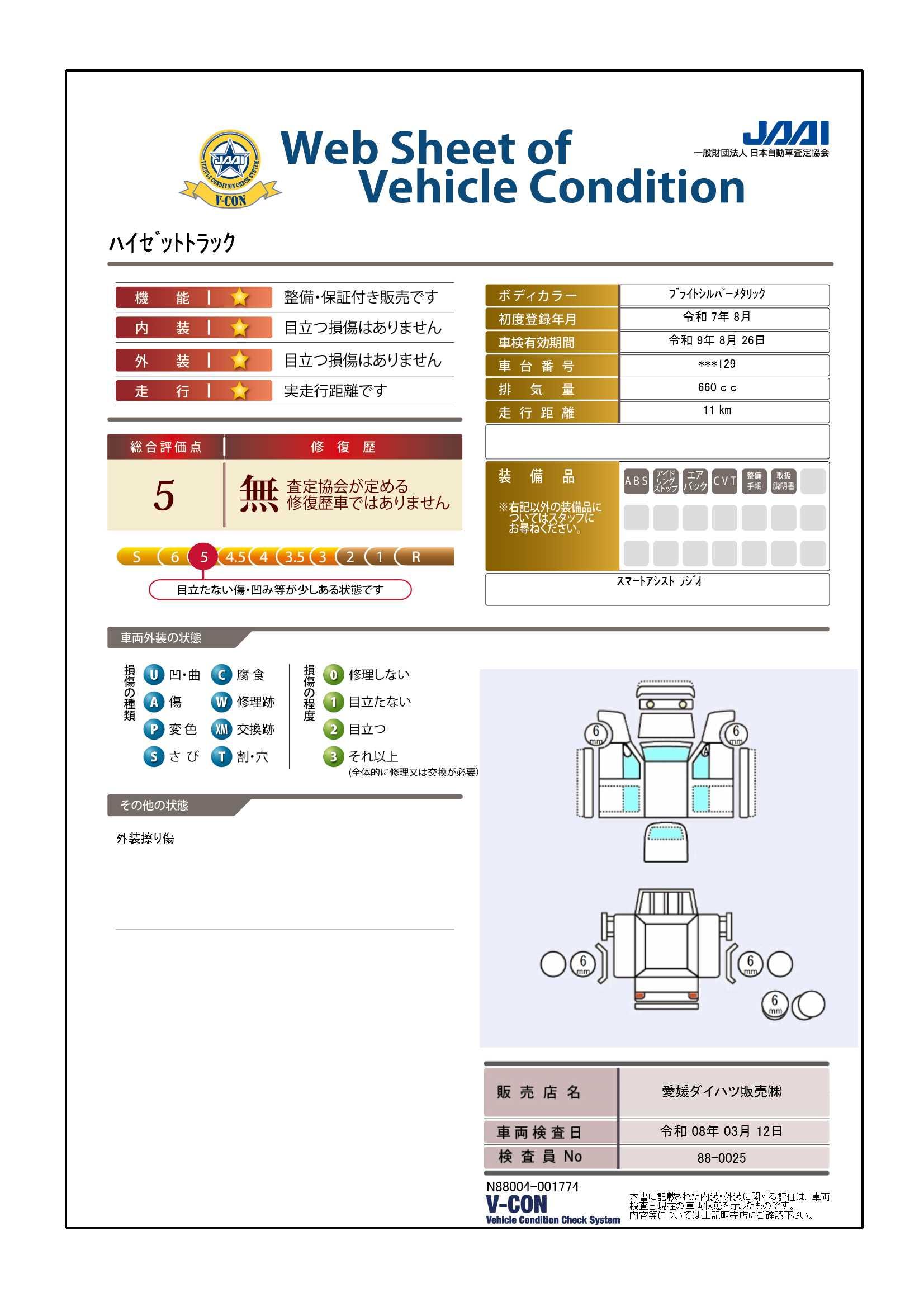 車両状態証明書修復歴の有無も一目瞭然。機能や内装・外装、走行距離、修復歴の有無をチェックし、クルマの状態を10段階にした車両状態証明書。数字や記号を使ってわかりやすく表示しています。