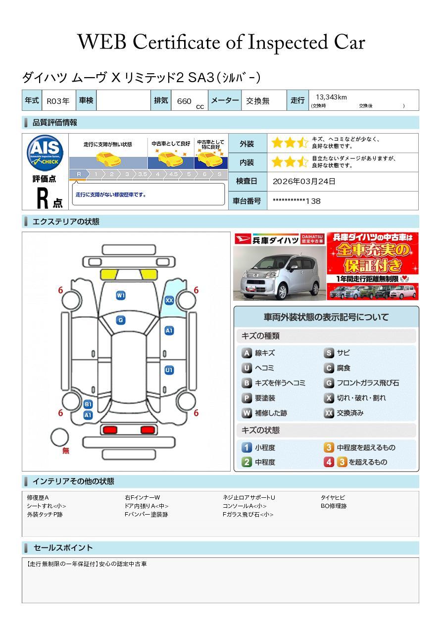 車両状態証明書が付いておりますので、安心してお選び出来ます。詳しくは、スタッフまでお気軽にお問合せください。