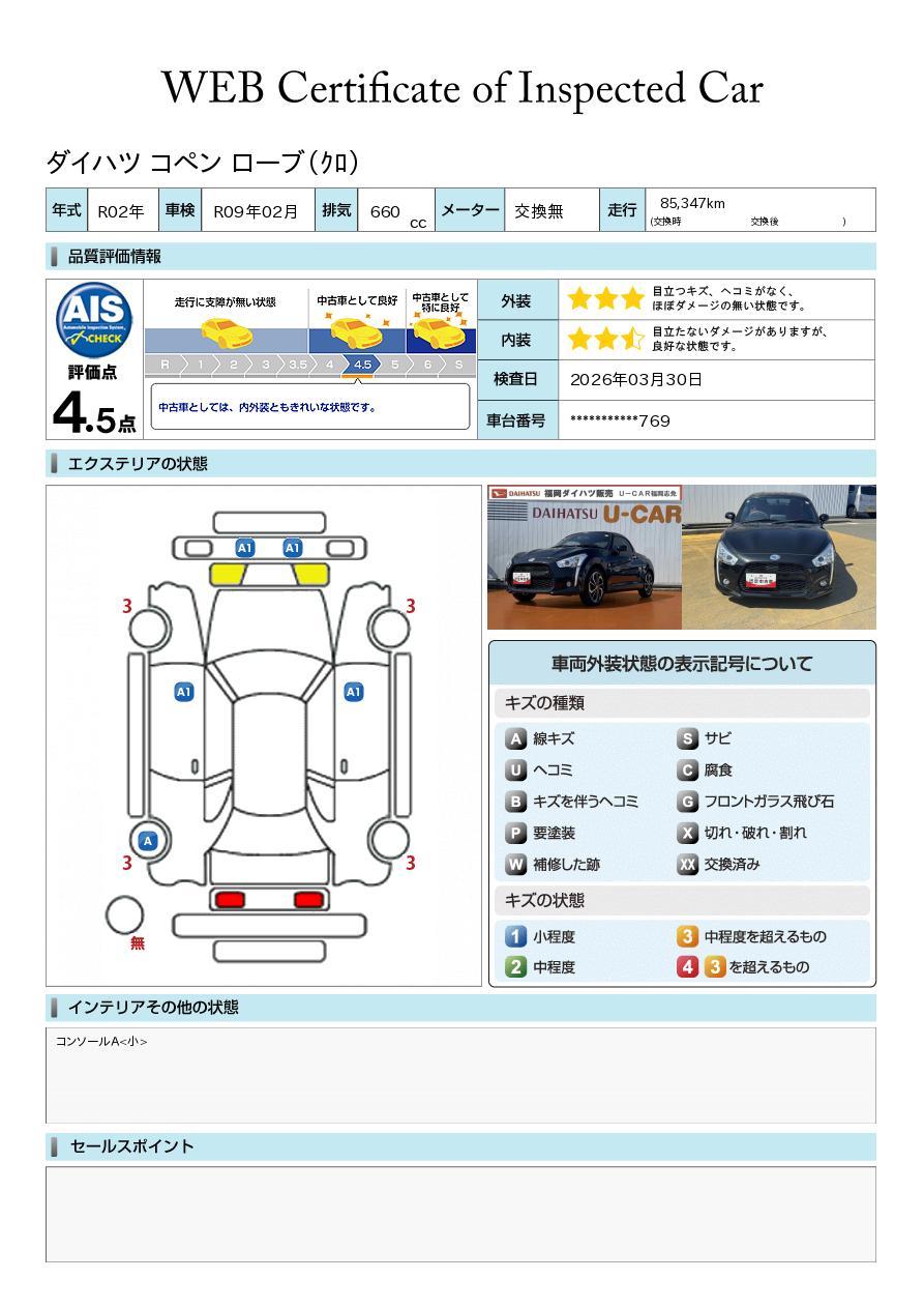 車両状態証明書が付いておりますので、安心してお選び出来ます。詳しくは、スタッフまでお気軽にお問合せください。