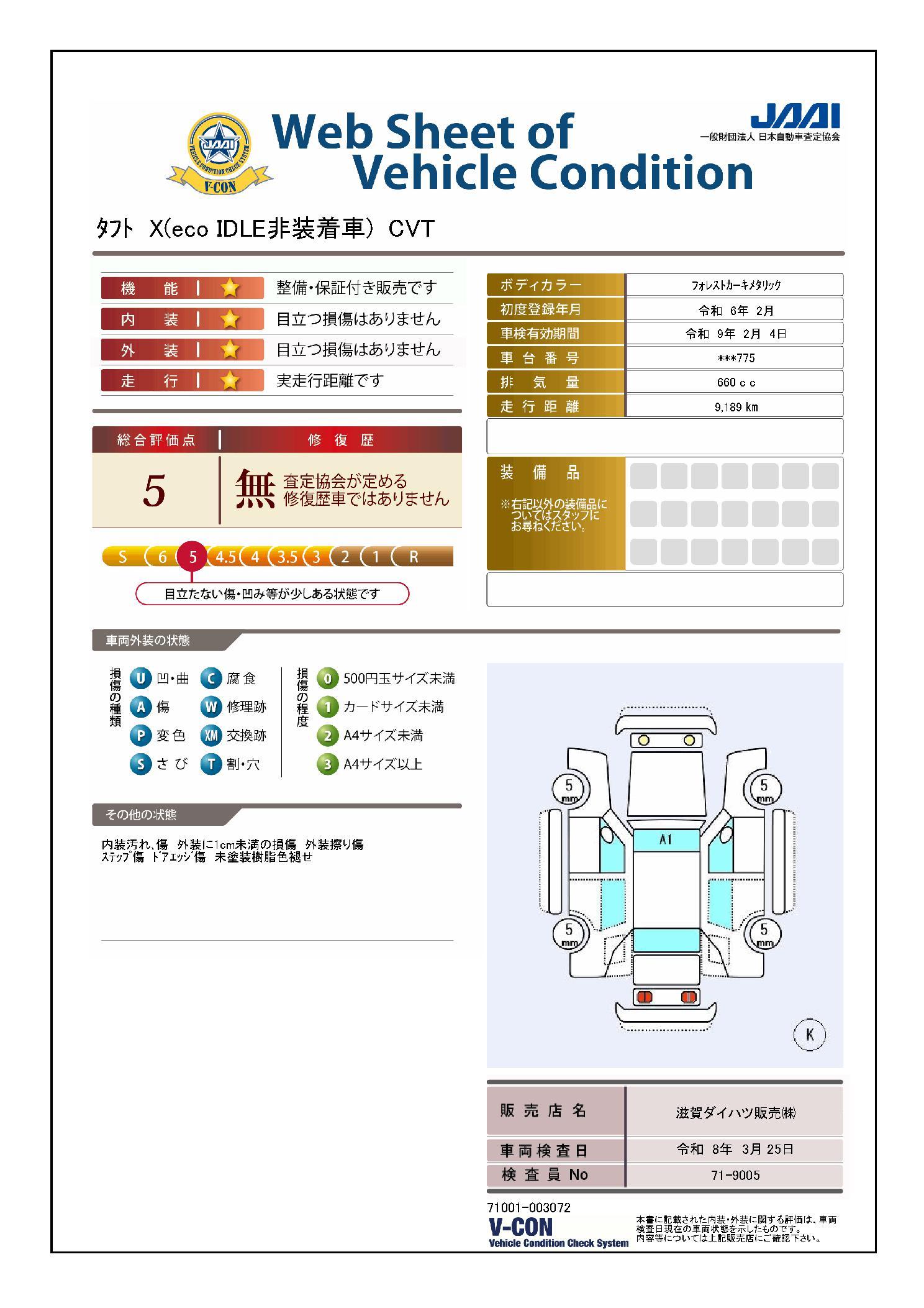 クルマの状態と評価点数を開示し、図解で表示いたしております。車両状態検査書はこちらの車両ページで閲覧できます。(※一部評価書が未設置の車両がある場合がございます)