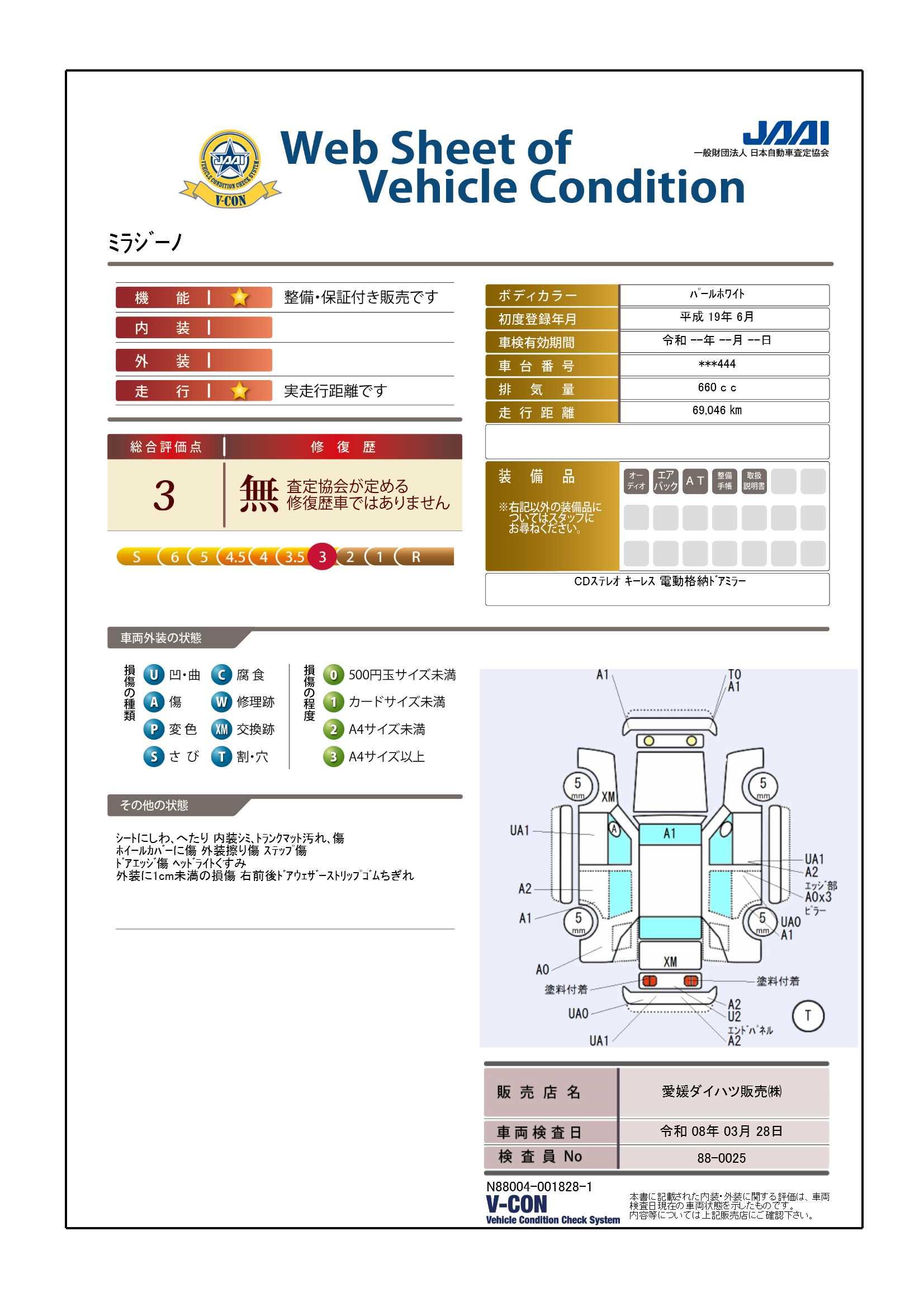 車両状態証明書修復歴の有無も一目瞭然。機能や内装・外装、走行距離、修復歴の有無をチェックし、クルマの状態を10段階にした車両状態証明書。数字や記号を使ってわかりやすく表示しています。