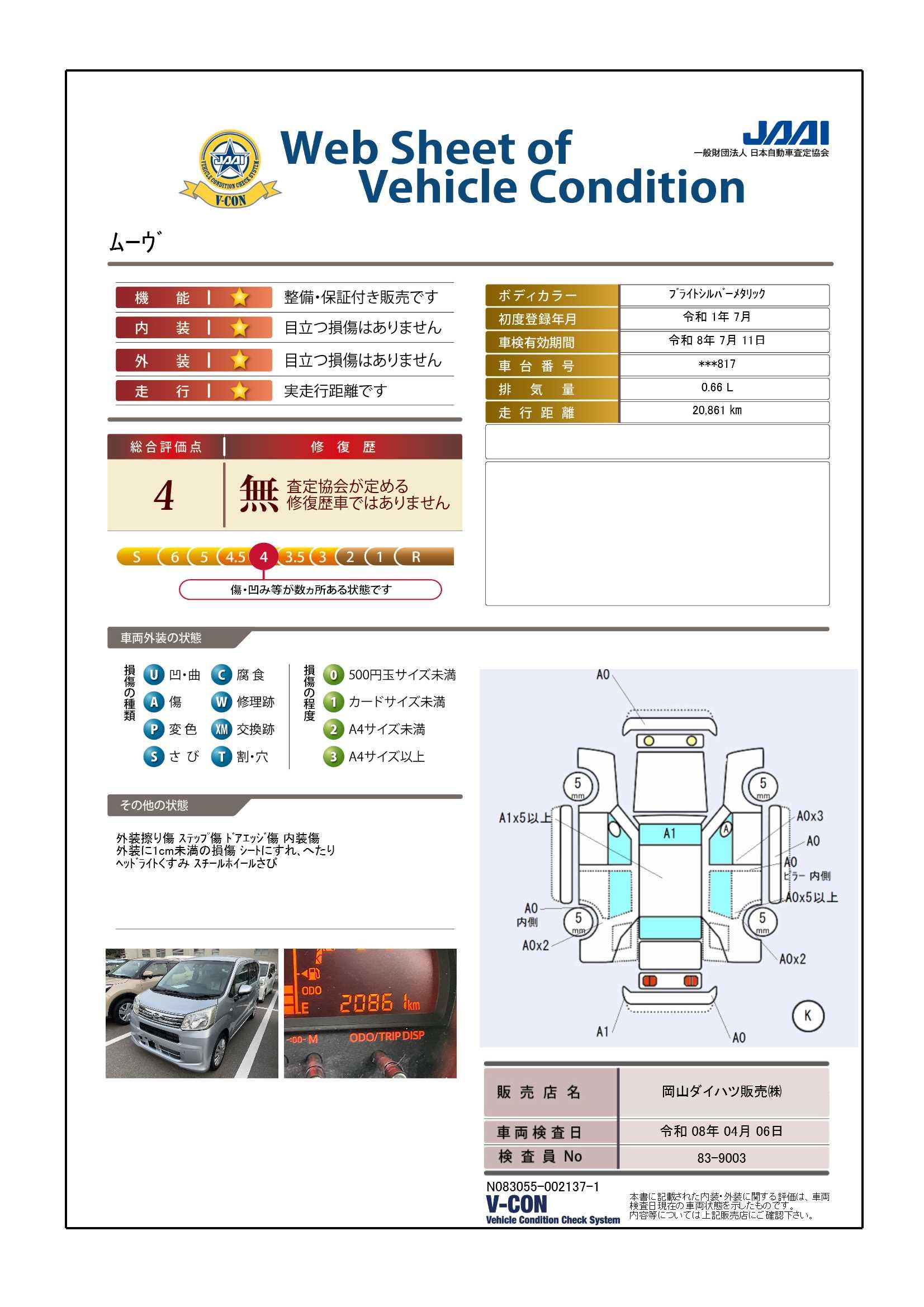 現状の車両の状態に関しましては必ず販売店に確認をお願いします。(2008年10月からの評価基準改定により、一部の車両につき店頭の評価表記と違う場合がございます。詳しくは販売店にお問い合わせください。