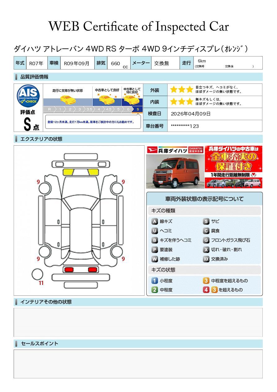 車両状態証明書が付いておりますので、安心してお選び出来ます。詳しくは、スタッフまでお気軽にお問合せください。