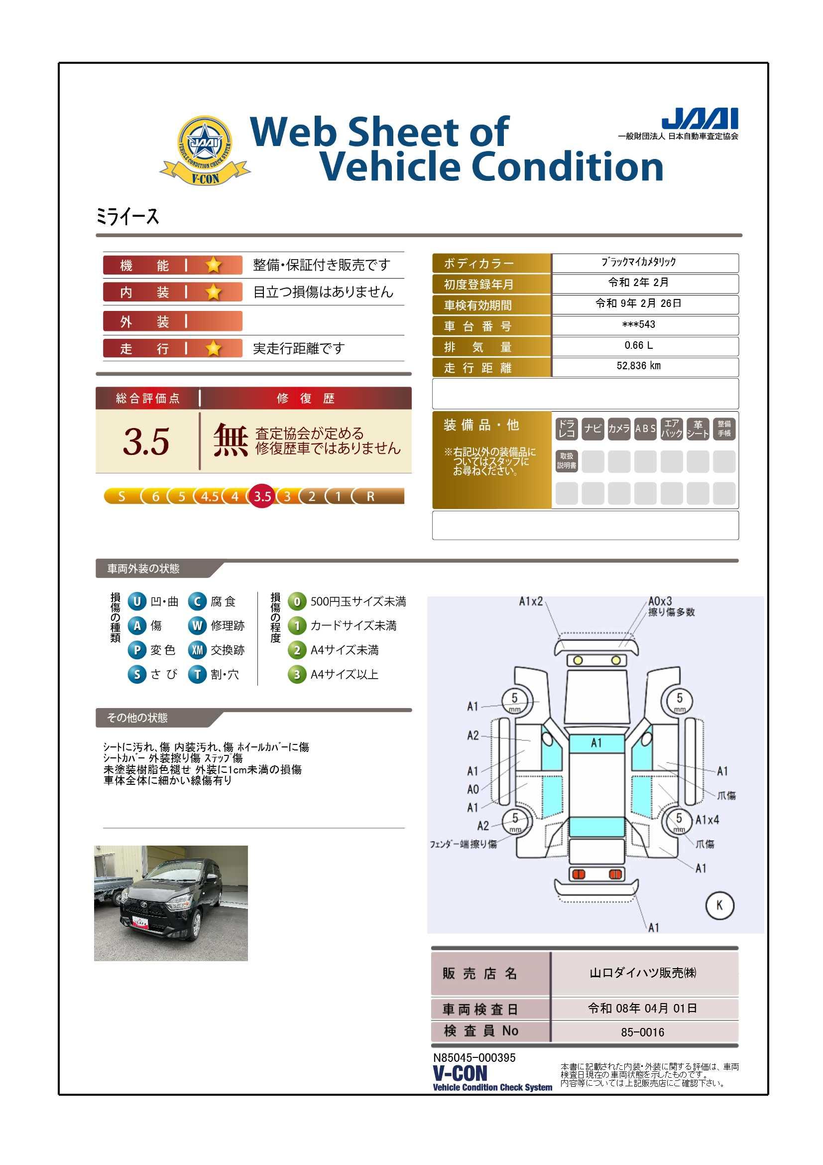 現状の車両の状態に関しましては必ず販売店に確認をお願いします。(2008年10月からの評価基準改定により、一部の車両につき店頭の評価表記と違う場合がございます。詳しくは販売店にお問い合わせください。