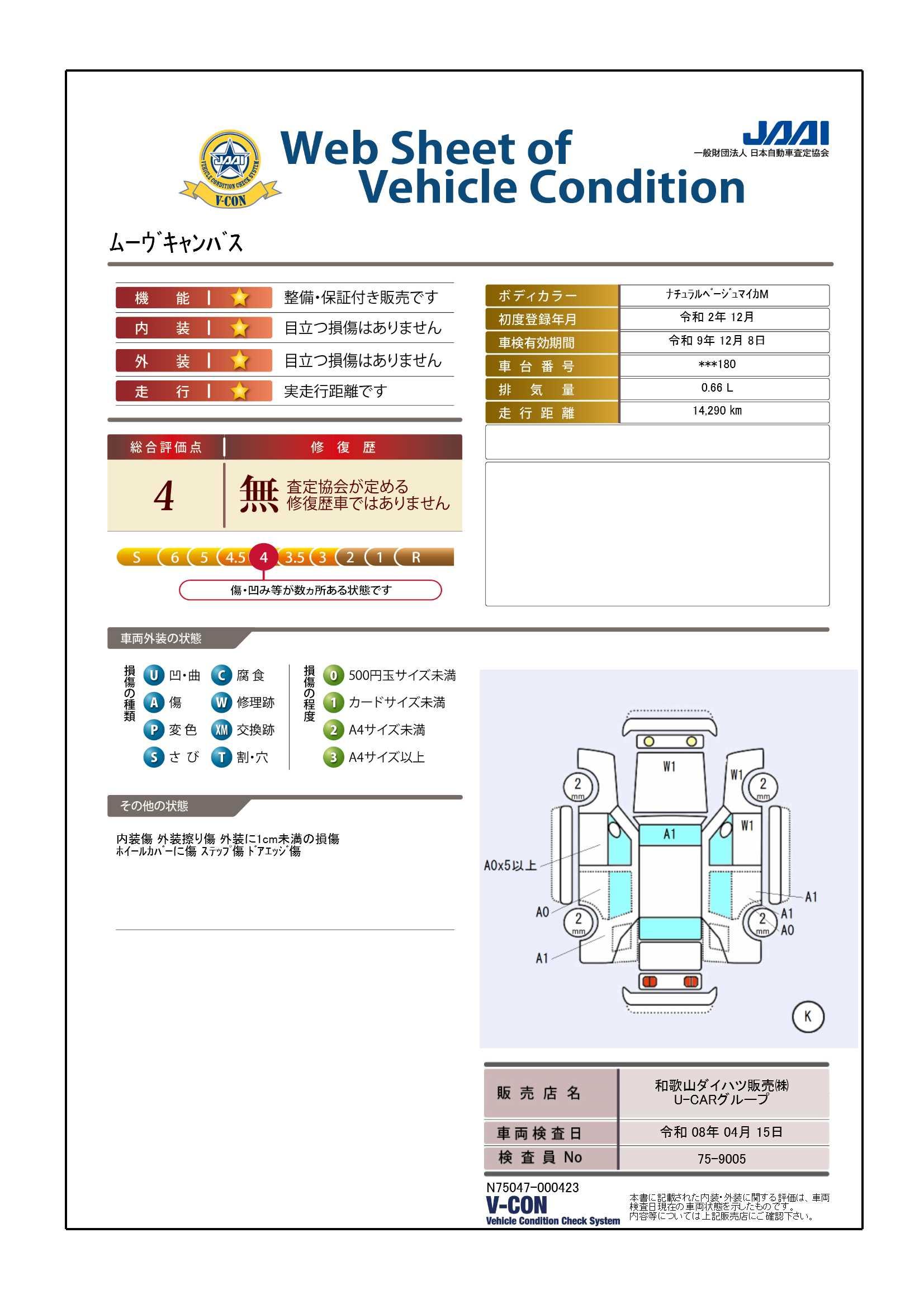 車両状態証明書の見方となります。検査団体によって、表記方法が異なりますので該当車両の車両状態証明書を御確認の上、ご覧ください。
