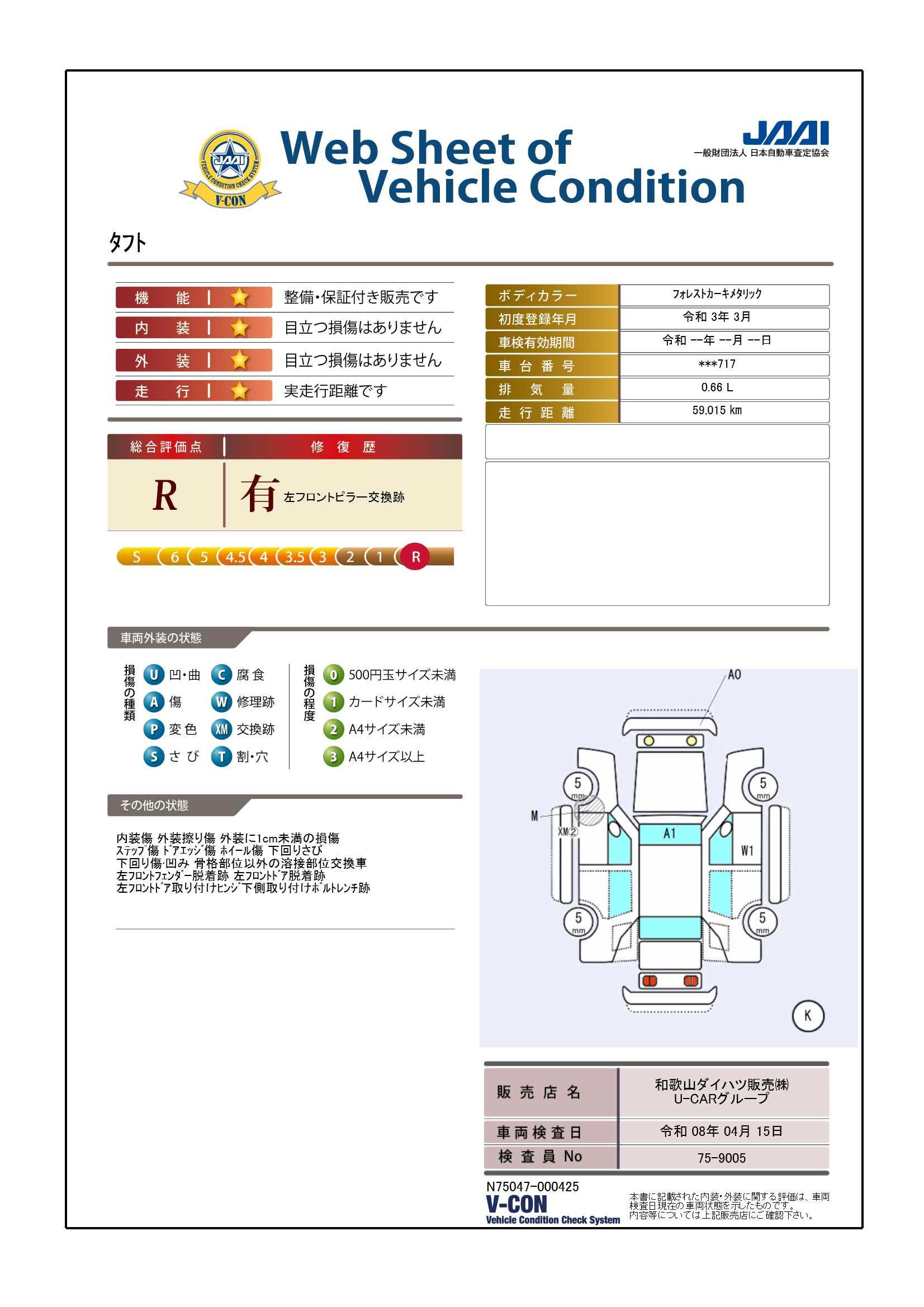 現状の車両の状態に関しましては必ず販売店に確認をお願いします。(2008年10月からの評価基準改定により、一部の車両につき店頭の評価表記と違う場合がございます。詳しくは販売店にお問い合わせください。