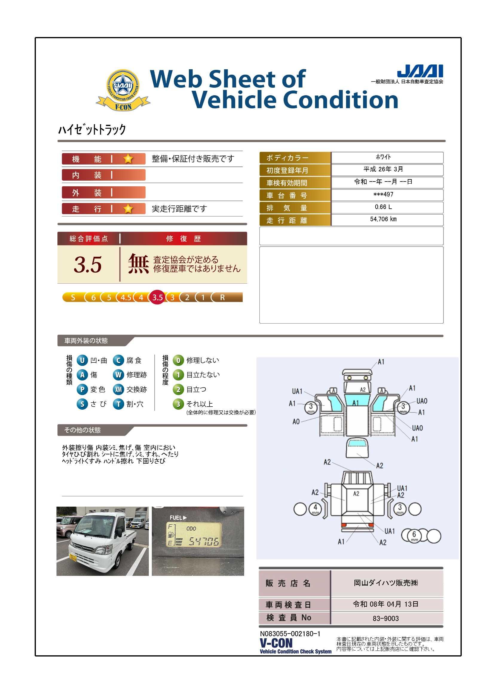 現状の車両の状態に関しましては必ず販売店に確認をお願いします。(2008年10月からの評価基準改定により、一部の車両につき店頭の評価表記と違う場合がございます。詳しくは販売店にお問い合わせください。