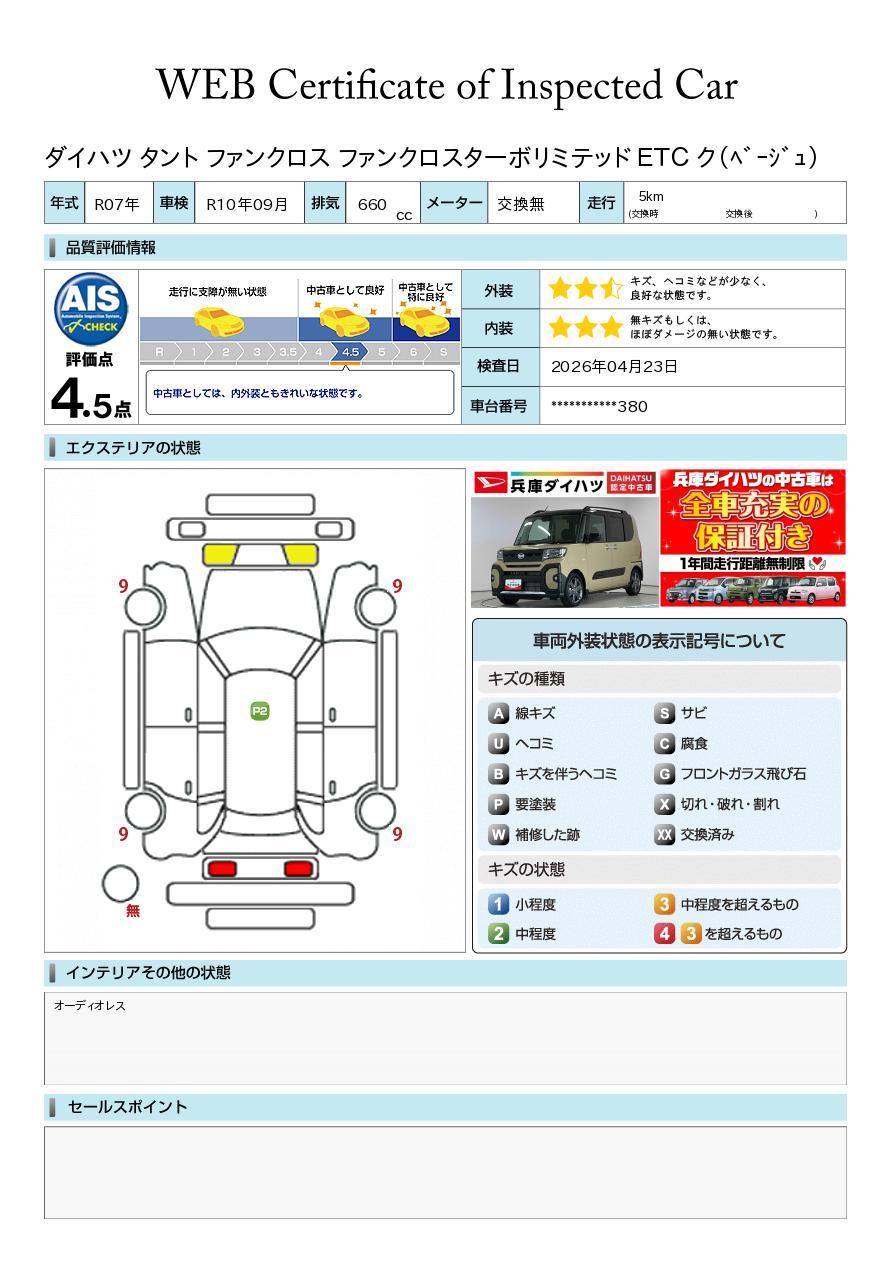 車両状態証明書が付いておりますので、安心してお選び出来ます。詳しくは、スタッフまでお気軽にお問合せください。