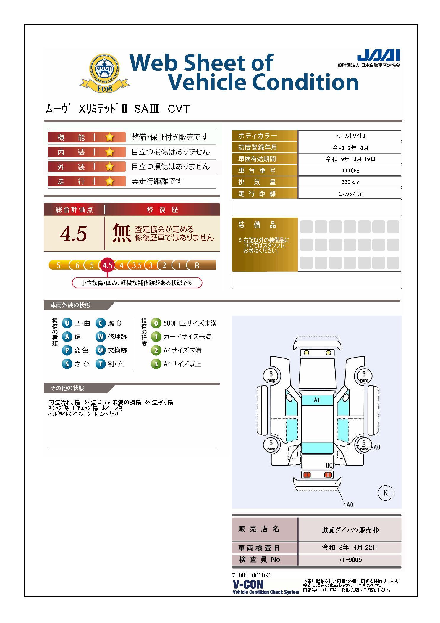 クルマの状態と評価点数を開示し、図解で表示いたしております。車両状態検査書はこちらの車両ページで閲覧できます。(※一部評価書が未設置の車両がある場合がございます)