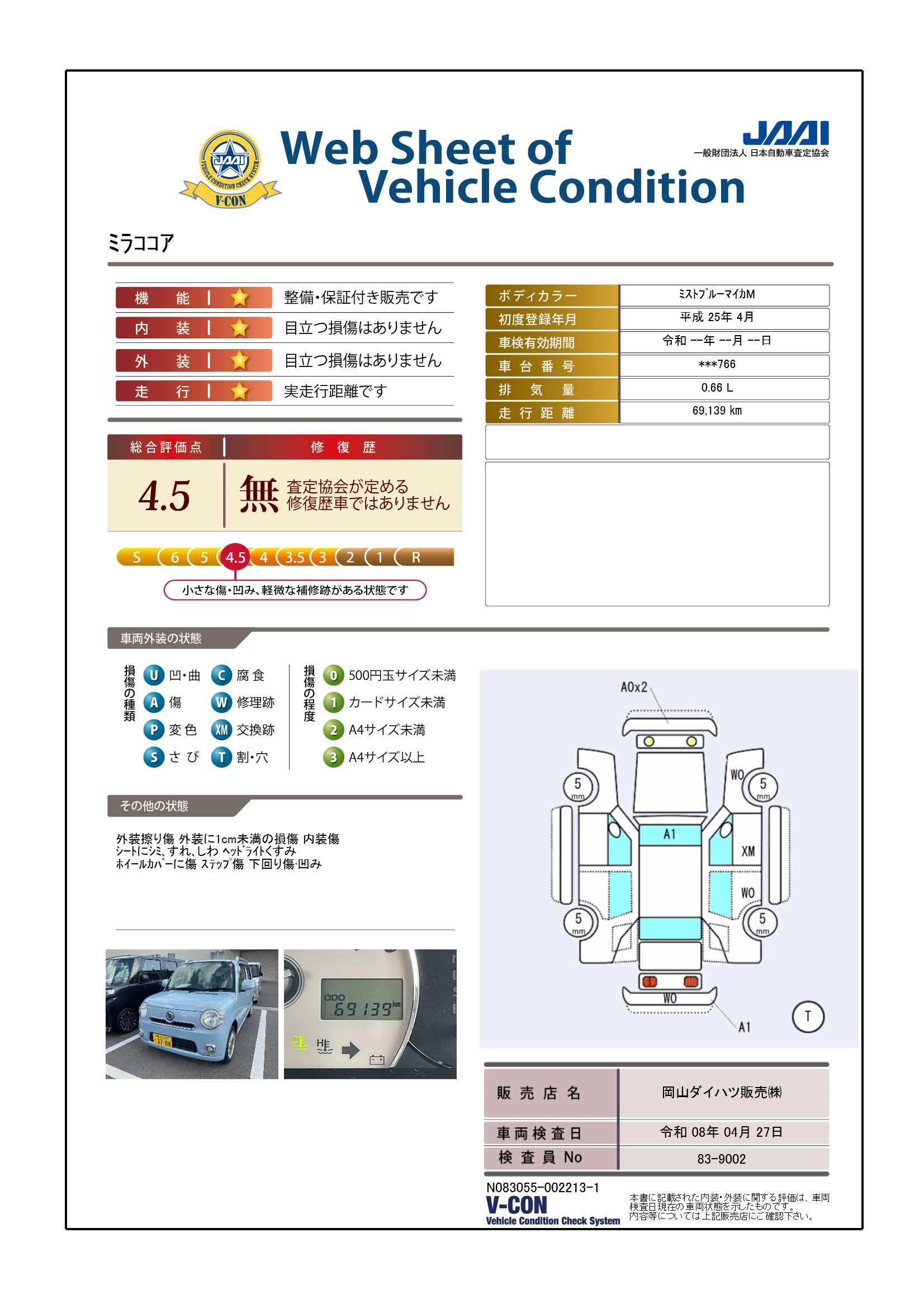 現状の車両の状態に関しましては必ず販売店に確認をお願いします。(2008年10月からの評価基準改定により、一部の車両につき店頭の評価表記と違う場合がございます。詳しくは販売店にお問い合わせください。