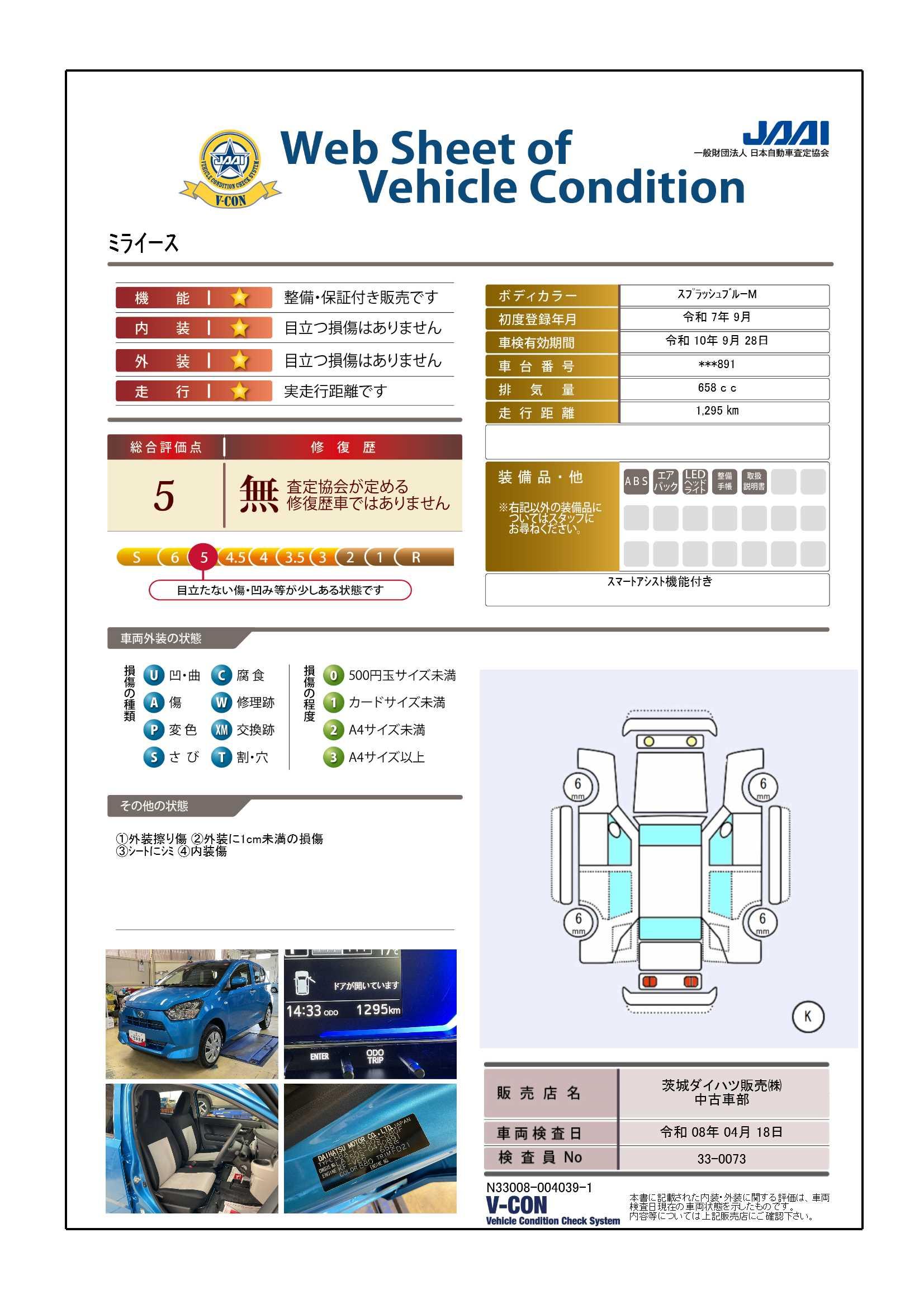 安心3【状態】車両状態証明書でキズや修復歴の有無を確認できます!気になる点は事前にご説明いたします♪
